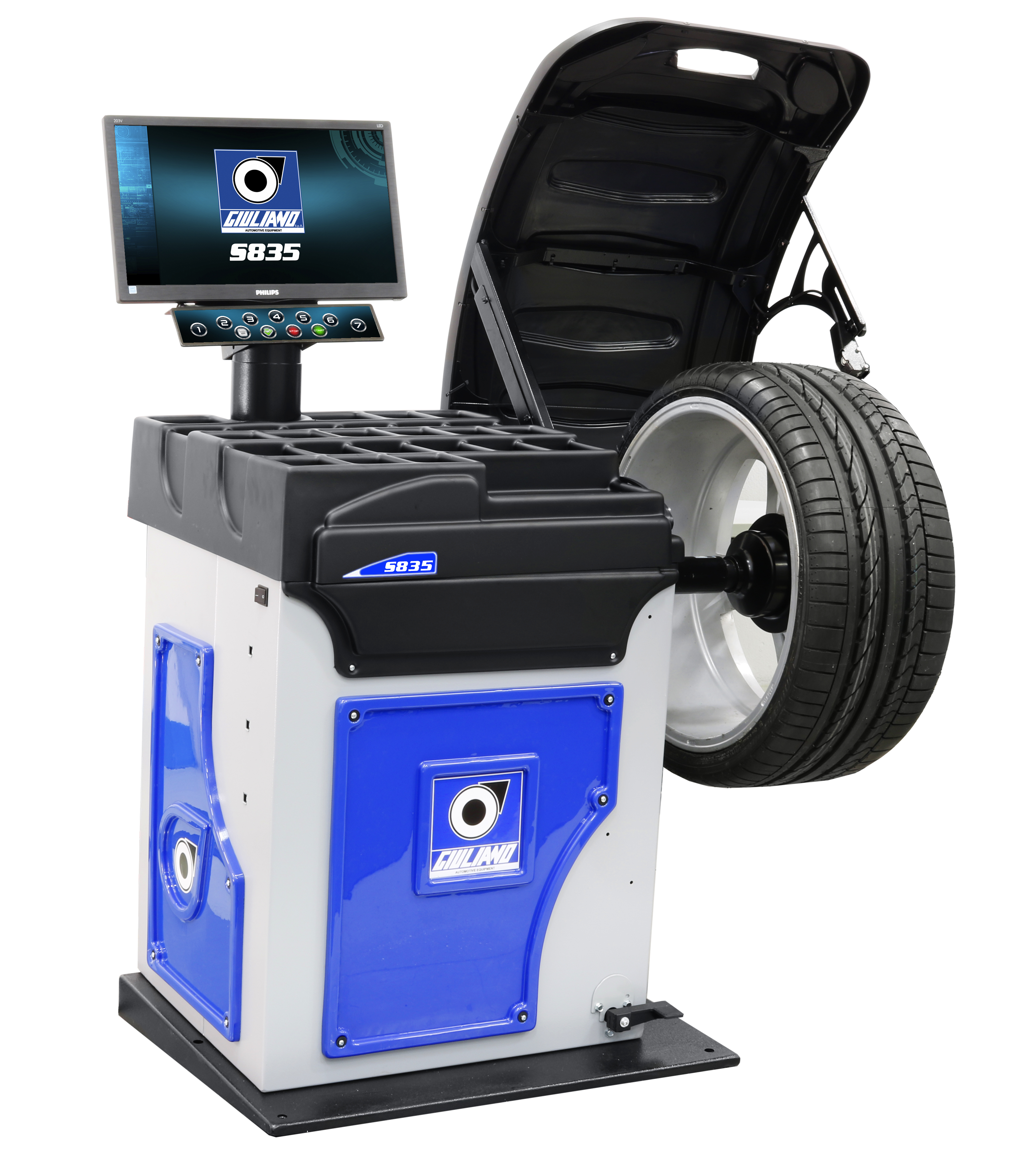 Линейка балансировочных стендов Giuliano позволяет подобрать модель, как в шиномонтажную мастерскую с небольшим объёмом работ, так и в крупный шинный центр обслуживающий большой поток клиентов с самыми различными типами колёс. Реализованные в балансировочном оборудовании дополнительные функции значительно упрощают работу оператора. Так к примеру функция OPPOSITE WEIGHT FUNCTION (OPF) (начиная с модели Giuliano S820), позволяет производить закрепление клеящегося груза вручную в позиции 6 часов, а не в привычной позиции на 12 ч. Стенды Giuliano S840, S850 имеют пневматическую систему зажима колеса, электромагнитную блокировку колеса и линейки при использовании функции установки клеящегося груза с помощью автоматической линейки ввода параметров. Также они могут быть дооснащены дополнительными датчиками по измерению радиального и торцевого биения колеса, что вкупе со стандартной возможностью измерить радиальное биение диска, при помощи линейки для вода параметров, даёт возможность не просто отбалансировать колесо, а и диагностировать его по ряду параметров.