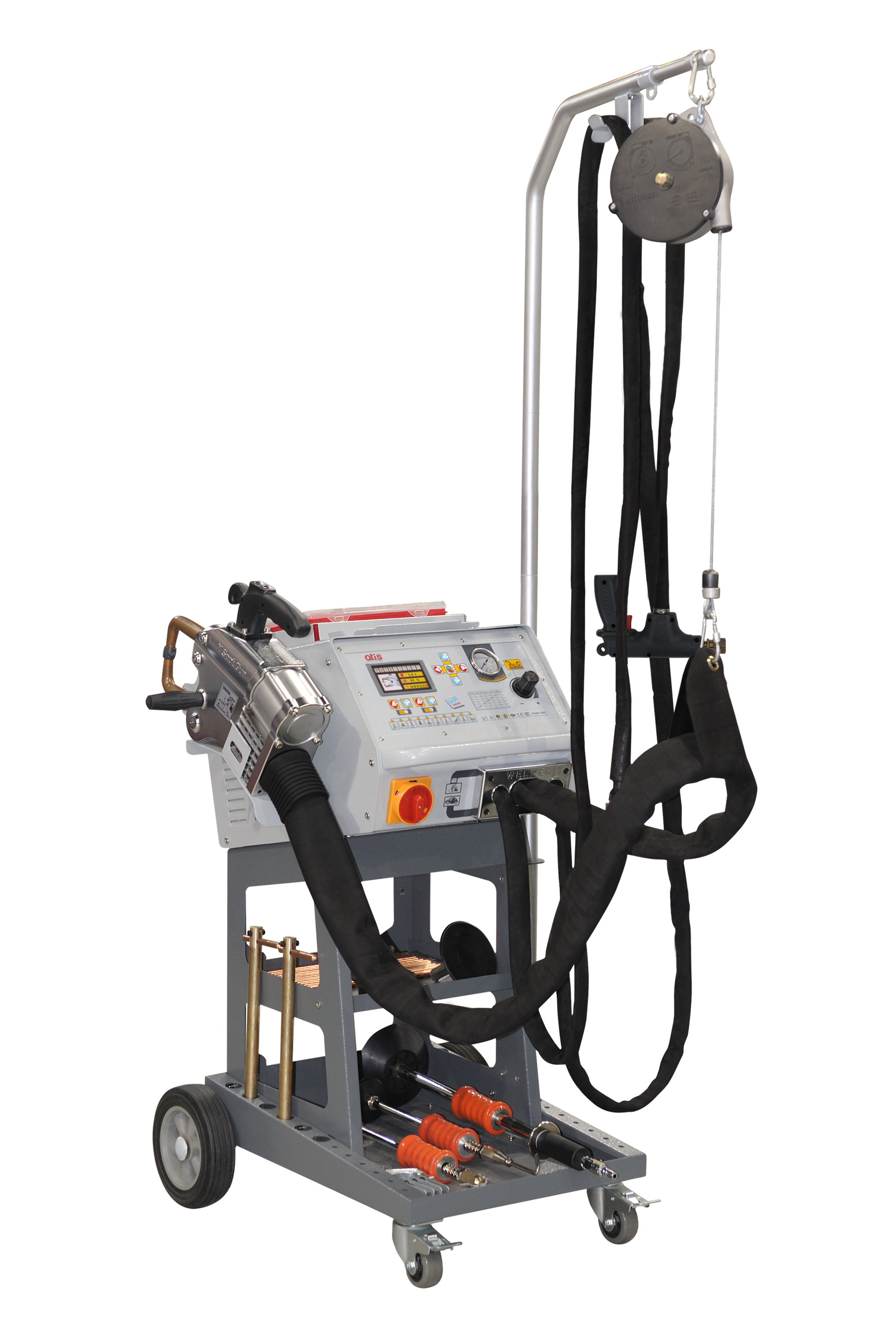 Сварочные приспособления и комплект аксессуаров: Тележка, клещи с пневмоприжимом, удлинители клещей, прогревающие электроды, вакуумная присоска с обратным молотком плюс три насадки-присоски, гребенка, обратный молоток, обратный молоток на пистолете, фильтр для очистки сжатого воздуха
