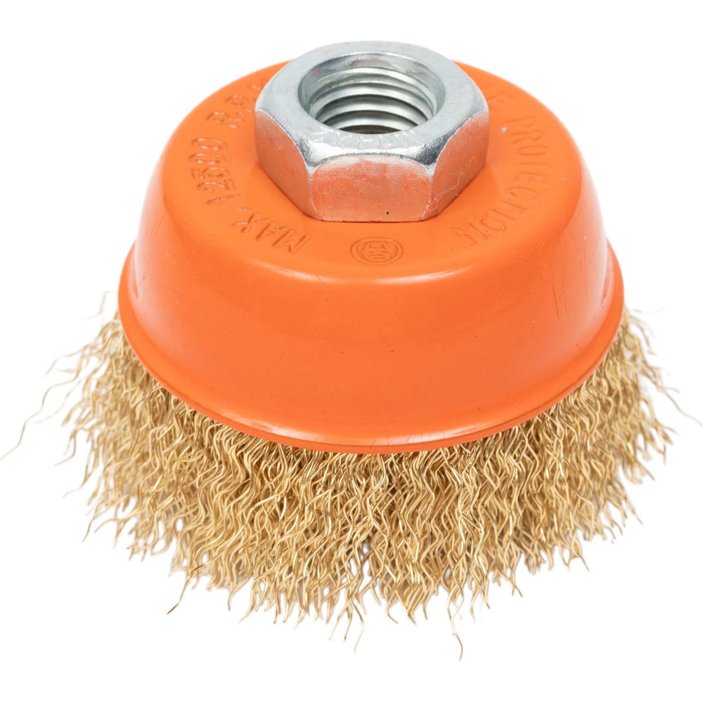 Щетка для УШМ, 65 мм, М14, "чашка", латунированная витая проволока Gigant G-110441L устанавливается на вал УШМ с помощью гайки М14. Предназначена для снятия тонкого слоя краски или лака, удаления ржавчины и загрязнений. При рекомендованной скорости вращения 12500 об/мин щеткой можно быстро обрабатывать участки большой площади.