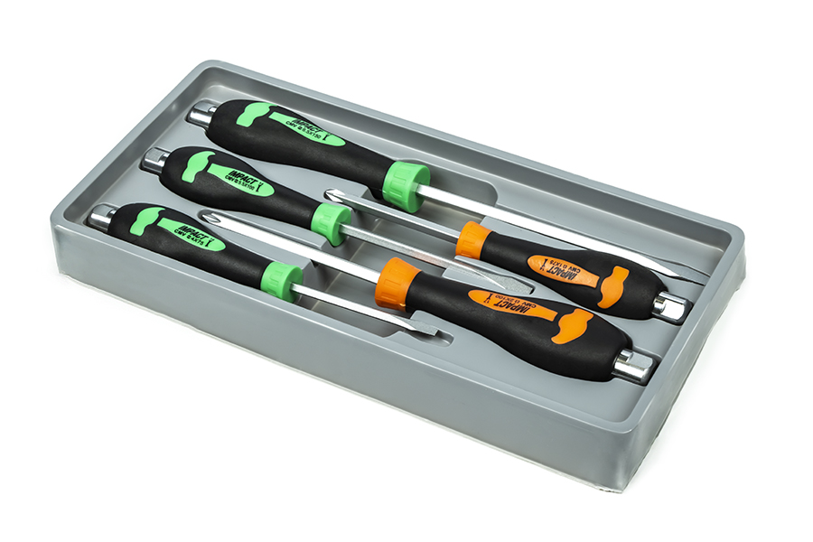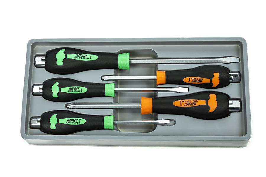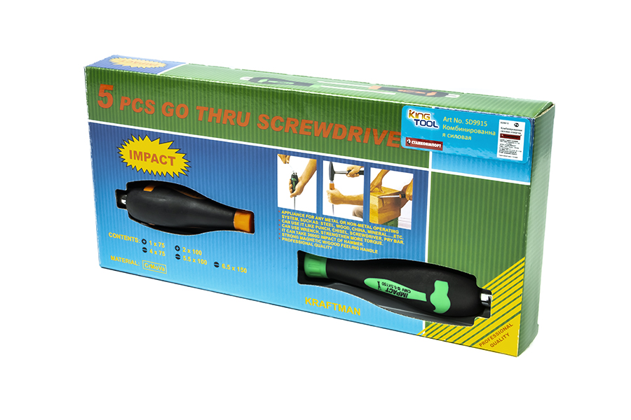 SD-9915 Набор силовых ударных отверток (5 предметов). Особенности: Можно использовать как зубило, отвёртка, ломик. Для увеличения крутящего момента, возможно использовать гаечный ключ. Металлический затыльник выдерживает удар молотка 3000G. Магнитные наконечники отверток. Ручки с резиновым покрытием для надежной фиксации. Комплект набора: Отвертка шлиц 6,5х150 мм - 1 шт. Отвертка шлиц 5,5х100 мм - 1 шт. Отвертка шлиц 4х75 мм - 1 шт. Отвертка PH 2х100 мм - 1 шт. Отвертка PH 1х75 мм - 1 шт. Картонная коробка с пластиковым ложементом - 1 шт.