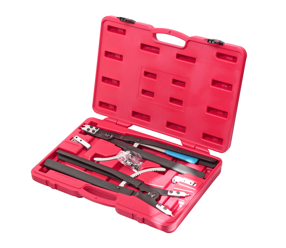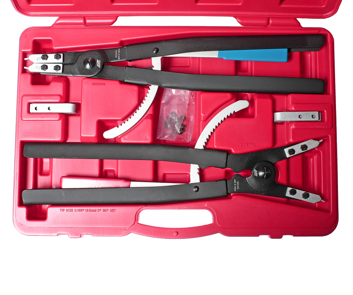 В набор входят сменные наконечники. Клещи с механизмом фиксации позволяют безопасно удерживать стопорные кольца, предохраняя их от повреждения.