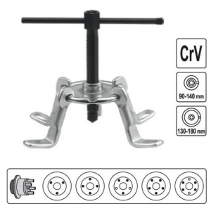 KA-1513 Съемник привода из ступицы, универсальный. Центральная площадка и упорные лапы изготовлены из инструментальной стали методом ковки. Резьбовой вал закален и способен выдерживать высокие нагрузки. Применение: Предназначен для разъединения шлицевого соединения приводного вала из ступицы. Характеристики: Диапазон захвата: 90-140 мм./130-180 мм.