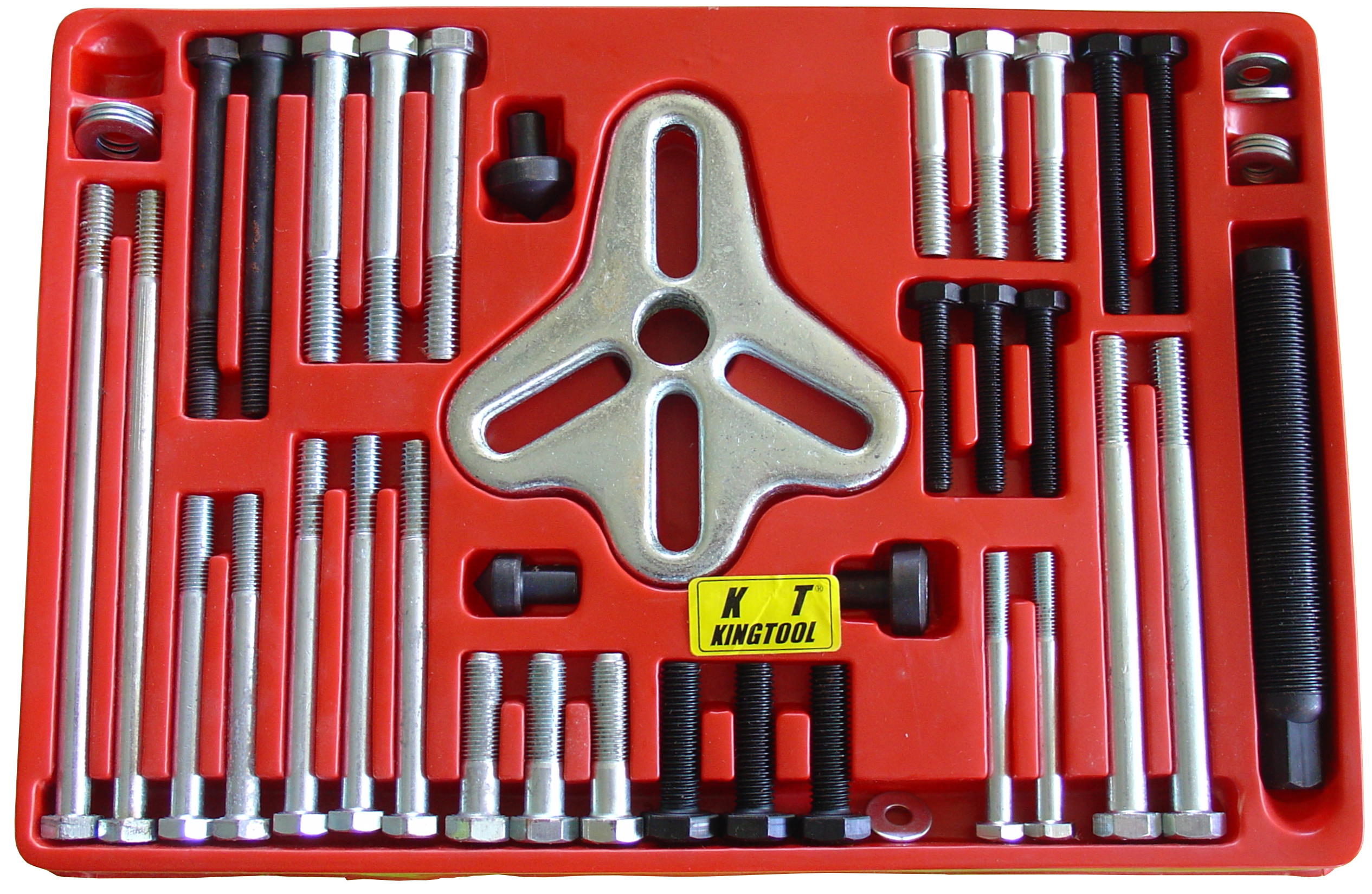 KA-1046 съемник шкивов с приспособлениями (46 пр). Используется для снятия шкивов. Принцип работы: Силовой болт вкручивается в центральное отверстье адаптера. Для удобства, на силовой болт возможно установить одну из трёх центрующих насадок. В отверстья шкива вкручиваются два или три подходящих болта через адаптер. Далее с помощью торцевой головки или гаечного ключа на 19 мм вращаете силовой болт, тем самым стягивая шкив с его оси. Особенности: Набор удобен в работе и, благодаря различным фиксирующим болтам и центрующим насадкам, является универсальным. Подходит для большинства марок и моделей легковых автомобилей. Комплект набора: Силовой болт (общая длина 130 мм) - 1 шт. Адаптер основной - 1 шт. Фиксирующие болты с различной длиной, диаметра и шагом резьбы - 30 шт. Шайбы - 11 шт. Насадка центрующая с выемкой - 1 шт. Насадка центрующая большая с конусом наружным - 1 шт. Насадка центрующая малая с конусом наружным - 1 шт. Инструкция - 1 шт. Коробка картонная с пластиковым ложементом - 1 шт. Использование набора допускается только квалифицированным персоналом с соблюдением техники безопасности!