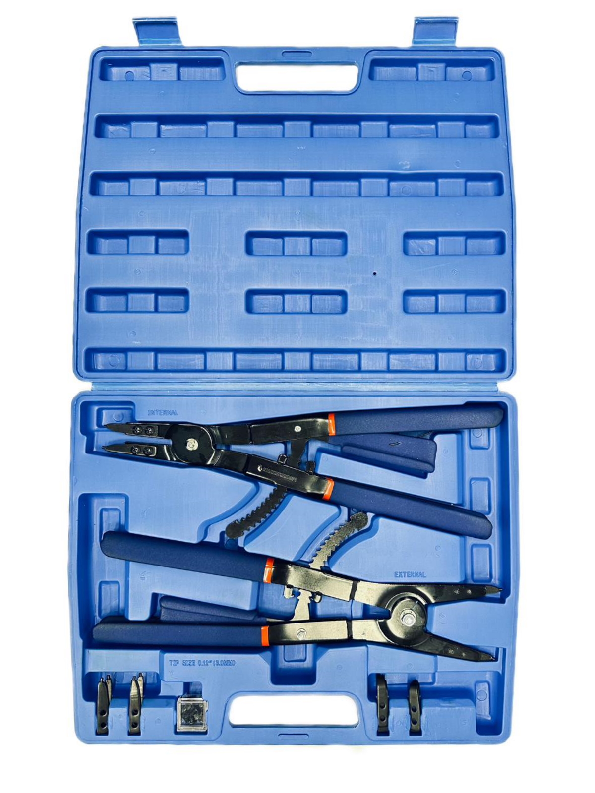 Клещи для стопорных колец для наружных стопорных колец, самостопорящиеся. Комплектация Клещи для внутренних стопорных колец; Клещи для внешних стопорных колец; Наконечники, 3 мм (прямые, 450 и 900); Кейс.