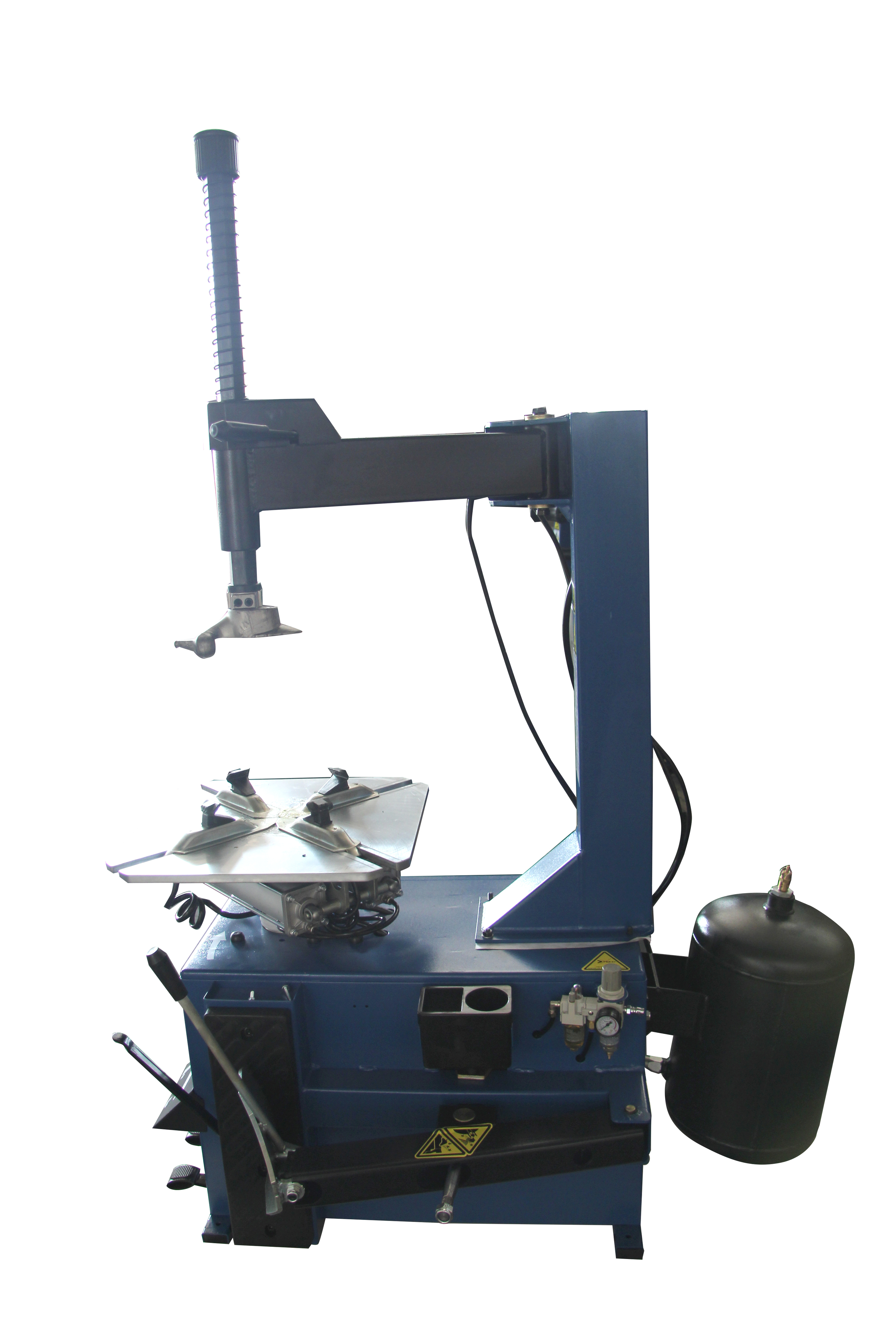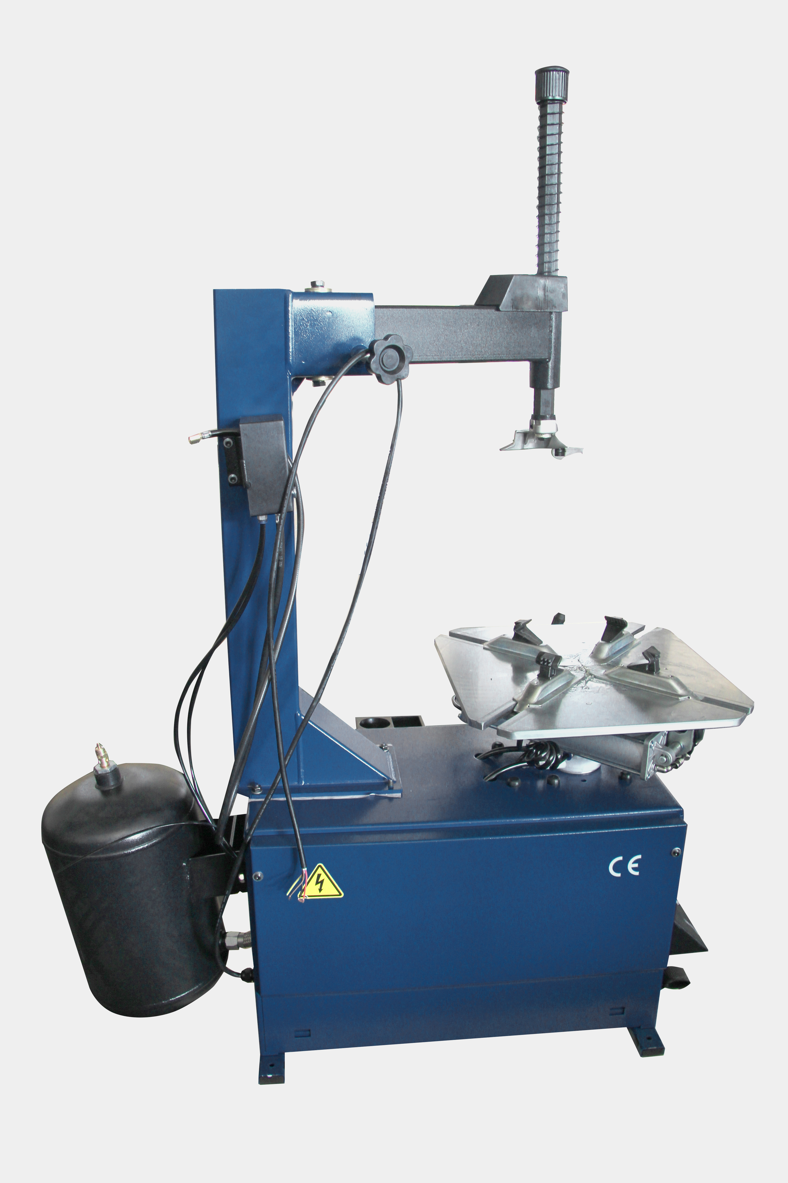 Мощный полуавтоматический станок с неотклоняемой монтажной стойкой, ресивером и устройством взрывной накачки бескамерных колес. Из отверстий в запирающих салазках в закрепленное колесо подается сильная струя сжатого воздуха. Благодаря чему бескамерная шина садится на колесный диск за минимальное время.