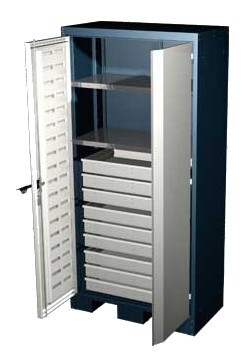 Шкаф для оснастки и инструмента: — 2 оцинкованные полки — 9 ящиков — ригельная система запирания , с тягами. — возможность крепления ящиков пластиковых на дверь шкафа — порошковая покраска RAL 7016; 3000,5015, панель ящиков RAL 7700. Шагрень Размеры: 950х500х1950h. Распределенная нагрузка на полку -200кг Распределенная нагрузка на ящик - 30кг. Вес: 170 кг., V-1,028 куб.