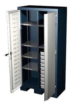Шкаф для оснастки и инструмента — 6 оцинкованных полок — 10 ящиков • Распределенная нагрузка на полку -100кг • Распределенная нагрузка на ящик - 30кг. Вес: 145 кг., V-1,028 куб..