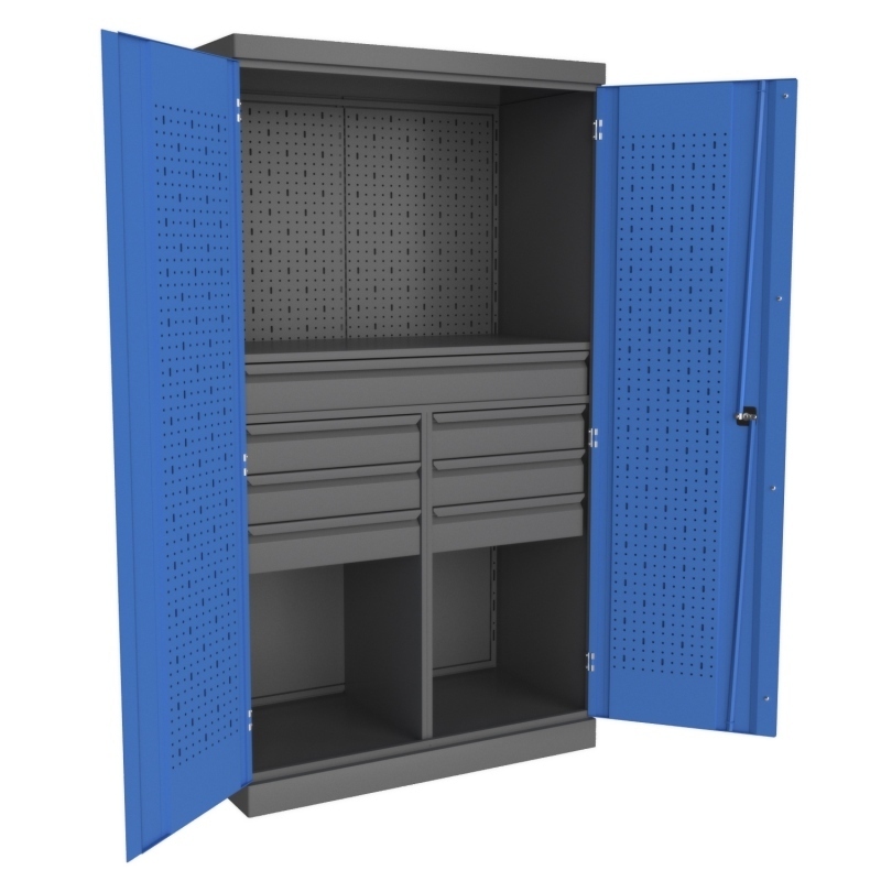 Шкаф инструментальный серии «PROFFI» предназначен для хранения оснастки, приспособлений и инструмента на рабочих местах в мастерских, цехах и других производственных зонах. Шкаф изготовлен из листовой стали и обеспечивает надежное запирание дверей ригельной системой.