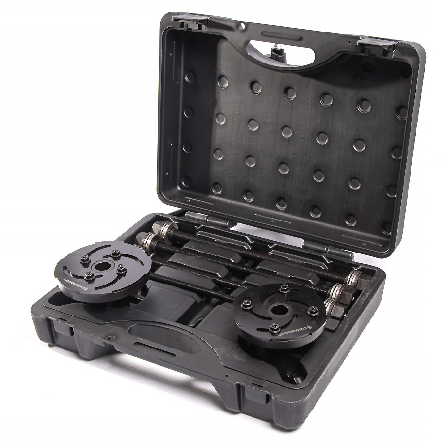 Назначение: Применяется для демонтажа и монтажа сайлентблоков рычагов при проведении обслуживания подвести. Особенности: Благодаря своей конструкции, за счет поворотных захватов, обеспечивается легкий и быстрый подгон съёмника на детали, а также надежное его удержание в процессе демонтажа. Съемник изготовлен из высококачественной хромованадиевой стали. Комплектация: Универсальные опоры – 2 шт. Силовая шпилька: М10х1.5х350 – 1 шт. М12х2.0х350 – 1шт. М14х2.0х350 – 1 шт. М16х2.5х350 – 1 шт. Подходит для большинства автомобилей. Если элемент не поддается выпрессовке, следует: прекратить работу, разобрать инструмент, обработать поверхность выпрессовочного элемента проникающей смазкой, типа WD-40. После этого следует повторить процедуру демонтажа. Во время работы используйте большое количество смазки для предотвращения деформации направляющей шпильки. Во время работы запрещено использовать ударный инструмент. Инструмент компании СТАНКОИМПОРТ соответствует требованиям стандартов качества ГОСТ и DIN, а по некоторым параметрам их превосходит.
