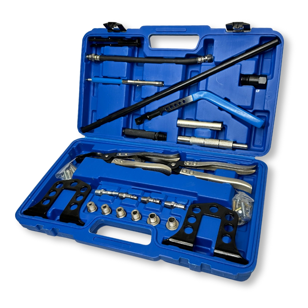 Рассухариватель предназначен для сжатия пружин впускных и выпускных клапанов автомобиля. Подходит для использования в большинстве отечественных и зарубежных двигателях. Подходит для ГБЦ двигателей системы OHV, OHC, SOHC и DOHC (twincam). Набор включает в себя всё необходимое для снятия стопорных сухарей клапанов, а также для снятия и установки клапанных пружин и маслосъёмных колпачков; Конструкция позволяет использовать одну руку для сжатия пружины, вторая рука остается свободной для демонтажа сухарей; В случае эксплуатации набора на двигателе без демонтажа ГБЦ следует использовать специальные адаптеры для подачи сжатого воздуха в камеру сгорания. Благодаря этому давление воздуха держит клапан со снятой пружиной на своём месте, не позволяя ему упасть в цилиндр. Комплектация Держатели опорной штанги , 2 шт.; Опорная штанга; Рычаг; Прижимная втулка клапанной пружины; Крепёжные винты и штифты, 14 шт.; Адаптеры резьбовые для подачи воздуха, 2 шт.; Шланг воздушный; Адаптеры быстросъёмные для подключения компрессора, 4 шт.; Щипцы для снятия маслосъёмных колпачков прямые; Щипцы для снятия маслосъёмных колпачков изогнутые; Оправки для установки маслосъёмных колпачков, 6 шт.; Инструмент для снятия и установки сухарей клапанов; Инструкция; Кейс.