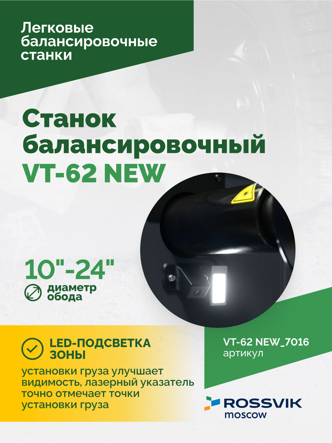 Станок балансировочный ROSSVIK VT-62 NEW (электронная линейка, автостоп, LASER, LED) RAL7016 СЕРЫЙ