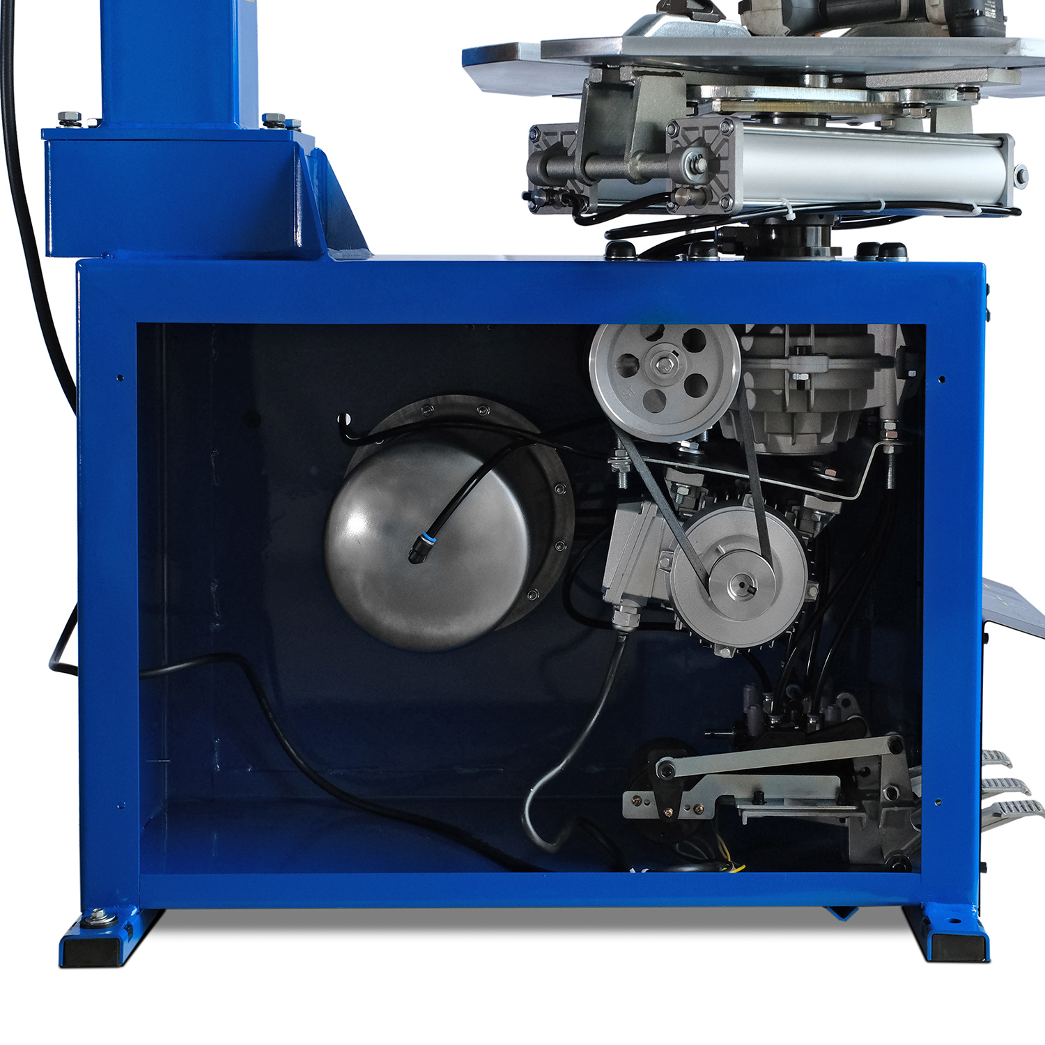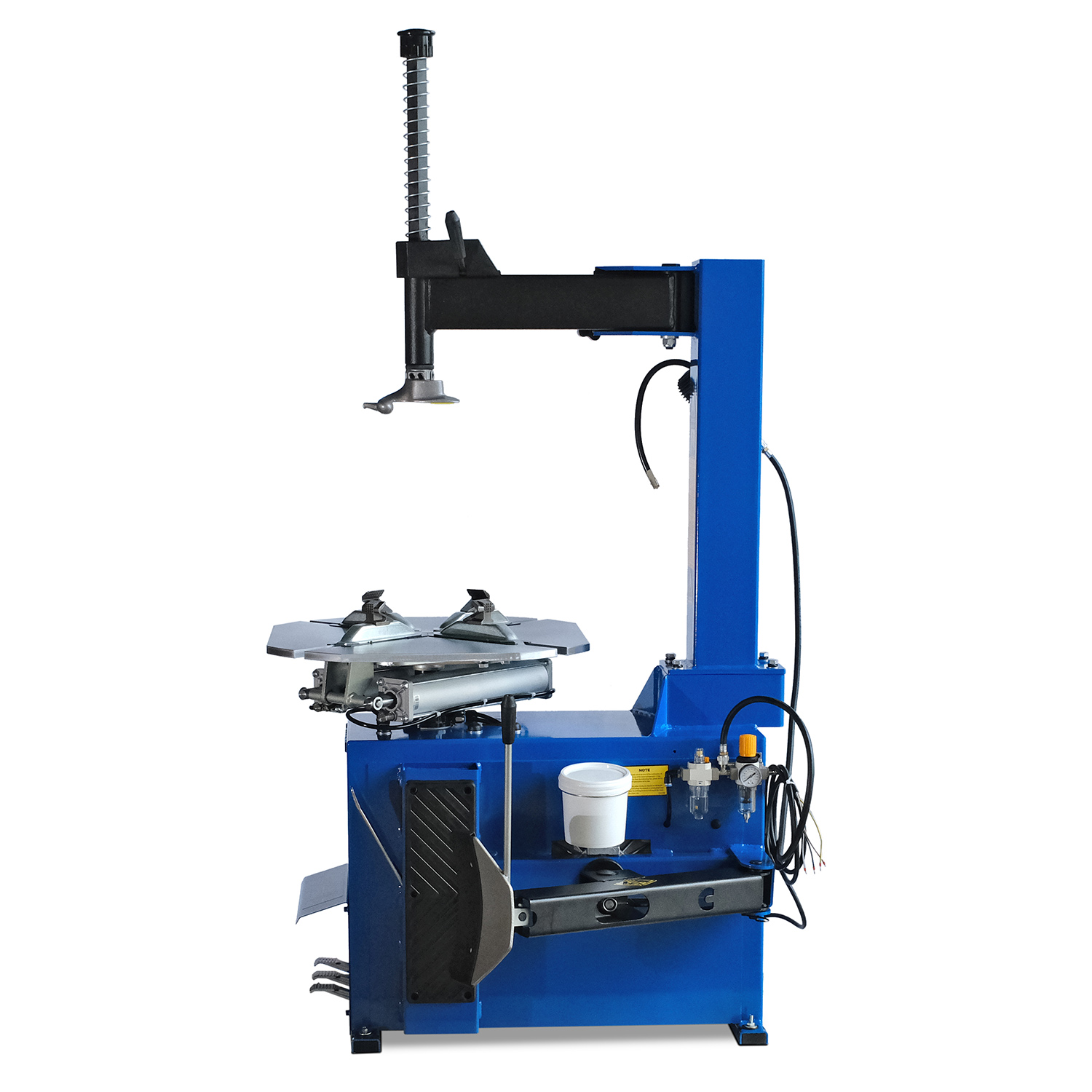 Поворотный стол с гальваническим покрытием обеспечивает долговечность и надежность работы, а шиномонтажные зажимные кулачки и головка с пластиковым протектором защищают диск при монтаже/демонтаже автошины.