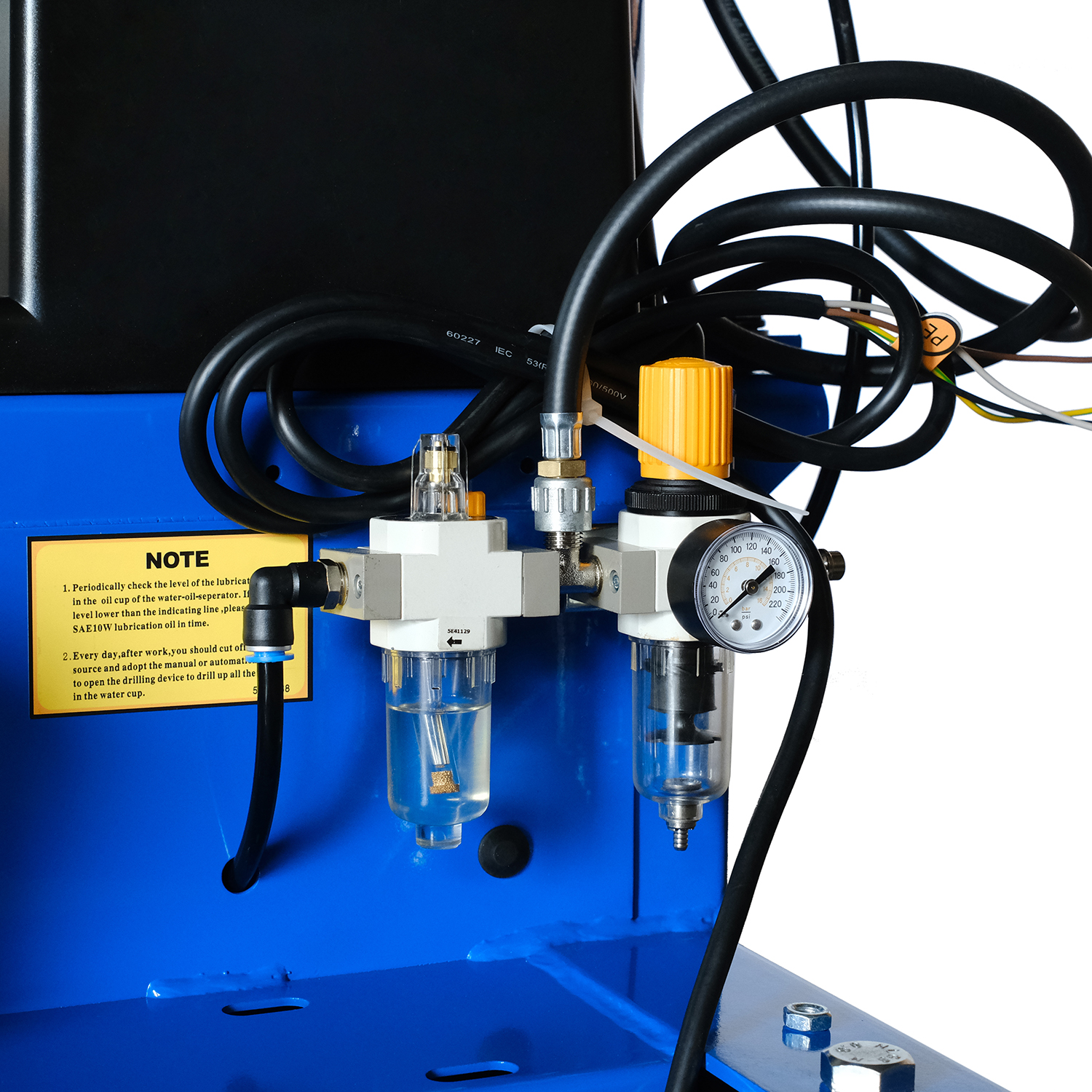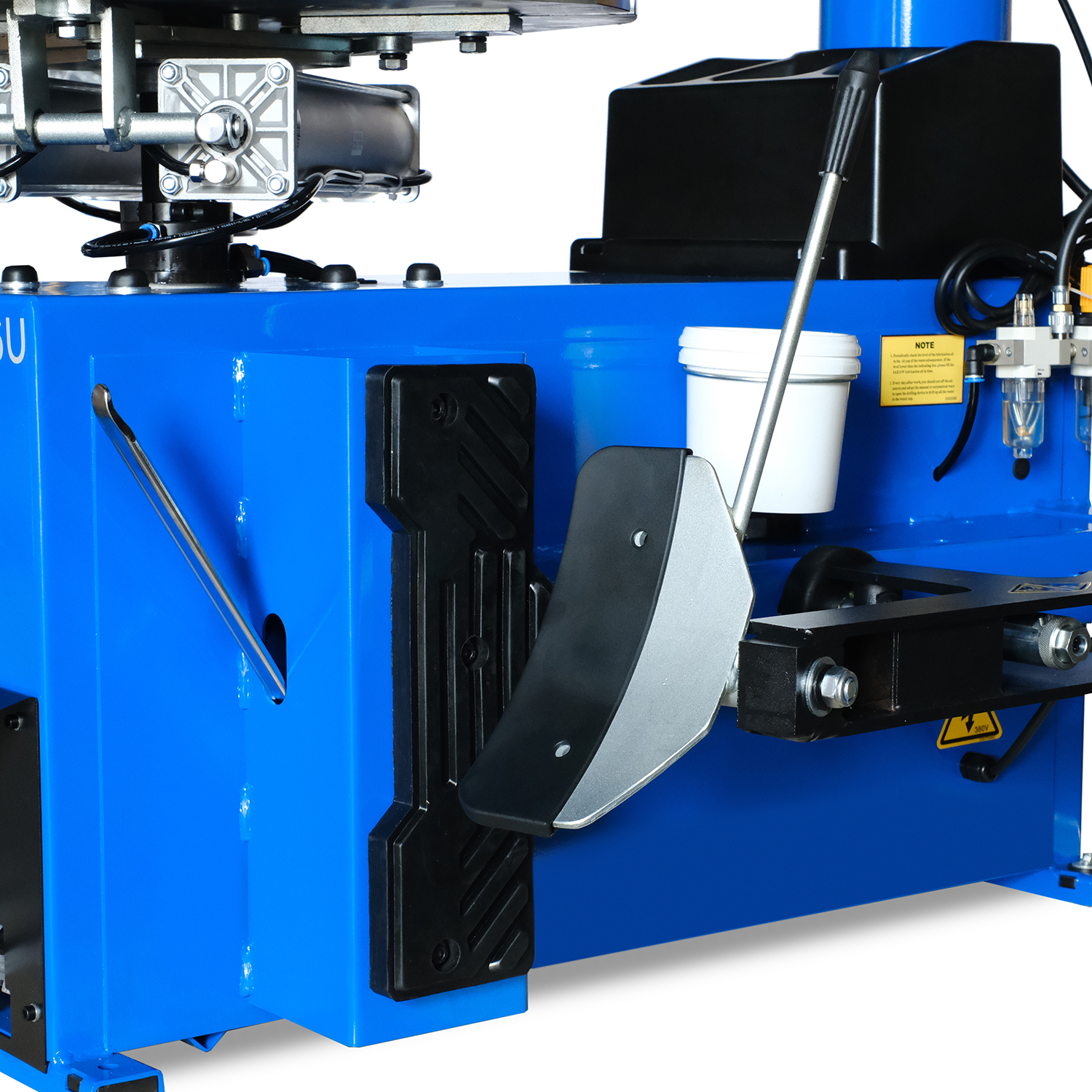 Оснащение блоком подготовки воздуха, включающим регулятор давления, масловлагоотделитель и лубрикатор, обеспечит стабильность и долговечность работы станка. Монтажная головка позиционируется относительно обода по горизонтали и вертикали, что гарантирует точность и удобство в работе.