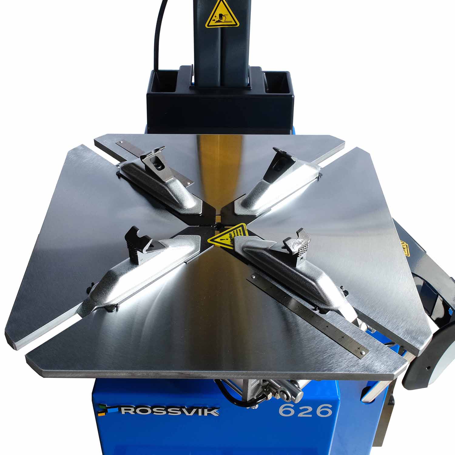 Поворотный стол с гальваническим покрытием обеспечивает долговечность и надежность работы, а шиномонтажные зажимные кулачки и головка с пластиковым протектором защищают диск при монтаже/демонтаже автошины. Это особенно важно для сохранения целостности диска и предотвращения его повреждений.