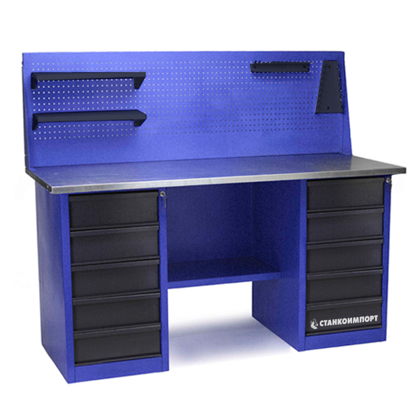 Слесарные верстаки СТАНКОИМПОРТ применяются в профессиональных авторемонтных мастерских, тюнинг ателье, частных гаражах и на производстве. Вестаки используются для выполнения различных работ по ремонту, сбору, обработке деталей, и является отличным рабочим местом для мастеров. Производятся данные верстаки на современном промышленном предприятии на территории РФ. Все основные технологические операции, такие как раскрой, резка, гибка, сварка и окраска листового металла осуществляется на высокоточном металлообрабатывающем оборудовании ведущих европейских производителей Италии и Дании. Основание верстака изготовлено из высокопрочного листового металла, а столешница из фанеры толщиной 24 мм, обшитой оцинкованным металлом толщиной 1 мм. Прочная конструкция верстака позволяет выдержать нагрузку на столешницу до 300 кг. Верстаки могут содержать в себе до 2 тумб с количеством ящиков от 1 до 5, а так же все модели могут быть дополнительно укомплектованы перфорированным экраном с полками. Ящики очень удобны для хранения инструмента и документации, за сохранность которых отвечает установленный центральный замок. Готовые верстаки покрыты порошковой краской (производство Германия). Все верстаки поставляются к клиенту в разобранном виде, с подробной инструкцией по сборке.