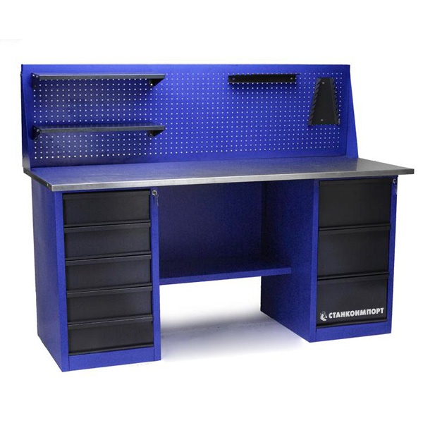 Слесарные верстаки СТАНКОИМПОРТ применяются в профессиональных авторемонтных мастерских, тюнинг ателье, частных гаражах и на производстве. Вестаки используются для выполнения различных работ по ремонту, сбору, обработке деталей, и является отличным рабочим местом для мастеров. Производятся данные верстаки на современном промышленном предприятии на территории РФ. Все основные технологические операции, такие как раскрой, резка, гибка, сварка и окраска листового металла осуществляется на высокоточном металлообрабатывающем оборудовании ведущих европейских производителей Италии и Дании. Основание верстака изготовлено из высокопрочного листового металла, а столешница из фанеры толщиной 24 мм, обшитой оцинкованным металлом толщиной 1 мм. Прочная конструкция верстака позволяет выдержать нагрузку на столешницу до 300 кг. Верстаки могут содержать в себе до 2 тумб с количеством ящиков от 1 до 5, а так же все модели могут быть дополнительно укомплектованы перфорированным экраном с полками. Ящики очень удобны для хранения инструмента и документации, за сохранность которых отвечает установленный центральный замок. Готовые верстаки покрыты порошковой краской (производство Германия). Все верстаки поставляются к клиенту в разобранном виде, с подробной инструкцией по сборке.