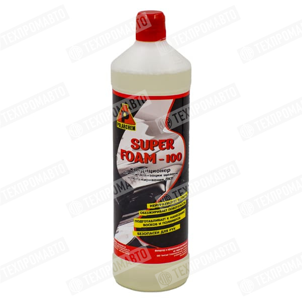 Концентрированный шампунь-кондиционер для бесконтактной и автоматической мойки автомобиля. Применяется как промежуточное звено между бесконтактным шампунем и шампунем второй фазы для удаления щелочной пленки и остатков статических загрязнений. При использовании Super Foam-100 значительно увеличивается эффект от применения шампуней второй фазы, консервантов и восков.