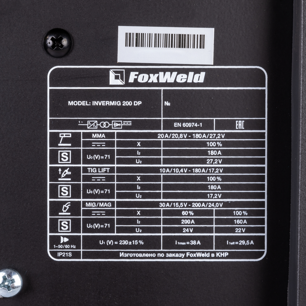 Сварочный инверторный полуавтомат FOXWELD INVERMIG 200 DP с синергетическим управлением предназначен для сварки проволокой MIG/MAG в импульсном и обычном режимах, а также может работать в режимах аргонодуговой сварки TIG и ручной сварки ММА. INVERMIG 200 DP — многофункциональный сварочный аппарат с двойным импульсом, высокой продолжительностью нагрузки, в нём предусмотрены выбор и сохранение программ и различные режимы управления горелкой. Конструкция аппарата имеет 2-роликовый полноприводный механизм подачи проволоки, интеллектуальную систему вентиляции, информативный жидкокристаллический дисплей. В аппарате предусмотрена розетка на 36 В для подключения подогревателя газа.РЕЖИМ DOUBLE PULSE: При двойном импульсе скорость подачи проволоки меняется во время сварки в соответствии с заданными параметрами. Режим DOUBLE PULSE идеален для сварки нержавеющей стали и алюминия (также благодаря очищающему воздействию быстрых фронтов переключения), особенно тонких листов, на которых можно добиться уровня качества, равного аргонодуговой сварке (TIG), при этом производительность будет более высокой. В режиме DOUBLE PULSE можно регулировать длительность тока импульса и тока паузы, что позволяет дополнительно управлять внешним видом шва и уменьшать зону термического влияния. Сварка в режиме DOUBLE PULSE упрощает процесс сварки алюминия и его сплавов, а также нержавеющих сталей, обеспечивая высокий уровень надежности соединения.ПОЛНОПРИВОДНЫЙ МЕХАНИЗМ ПОДАЧИ: В аппарате используется 2-роликовый полноприводный механизм подачи сварочной проволоки с двумя ведущими роликами. Полноприводный механизм подачи обеспечивает стабильную подачу сварочной проволоки при использовании длинных горелок и при продолжительном сварочном процессе. 2 ведущих ролика – это минимальная деформация и давление на проволоку, что критично для качественной сварки алюминия и сплавов.РАСШИРЕННЫЙ СИНЕРГЕТИЧЕСКИЙ РЕЖИМ УПРАВЛЕНИЯ: Синергетическое управление дает возможность модифицировать все сварочные параметры, осуществляя регулировку лишь одного из них. Наличие синергетического режима управления позволяет легко и быстро настроить аппарат под любую задачу. Преимущества синергетики: простота в настройке даже неквалифицированным персоналом, быстрая установка сварочных параметров, гарантированное получение качественного сварного соединения. Синергетику можно отключить для работы в ручном режиме.ИНФОРМАТИВНАЯ ПАНЕЛЬ УПРАВЛЕНИЯ: В аппарате большое количество функций и опций, которые настраиваются с помощью специальных ручек и кнопок. На жидкокристаллическом дисплее отображаются параметры сварочного тока и напряжения, режим сварки, диаметр сварочной проволоки, режим работы горелки.ФУНКЦИЯ VRD: Функция VRD (снижение напряжения холостого хода) повышает безопасность и исключает риск поражения сварщика электрическим током. Сварочный процесс становится более безопасным в замкнутых пространствах и при сварке в условиях повышенной влажности.ПРЕИМУЩЕСТВА:Режим DOUBLE PULSEРежим TIG LIFTИмпульсный режим сваркиИнтеллектуальное охлаждение2-роликовый полноприводный механизм подачиСохранение настроек параметров сваркиСинергетический режим управленияРозетка на 36 вольт для подключения питания обогрева редуктора газового баллонаФУНКЦИОНАЛЬНЫЕ ОСОБЕННОСТИ:СОХРАНЕНИЕ ПРОГРАММ: Наличие ячеек 