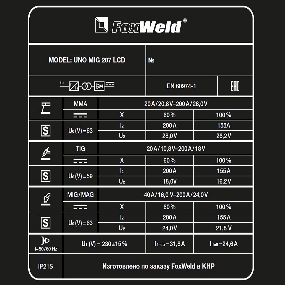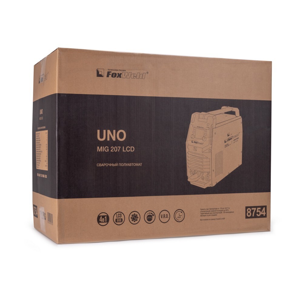 Сварочный полуавтомат FOXWELD UNO MIG 207 LCD — это многофункциональный сварочный аппарат с полностью цифровым управлением, который позволяет производить сварку изделий из углеродистой и нержавеющей стали, а также алюминиевых и медных сплавов. Синергетическое управление в режиме полуавтоматической сварки дает возможность модифицировать все сварочные параметры, осуществляя регулировку лишь одного из них – толщины металла. Наличие жидкокристаллического дисплея (LCD) облегчает процесс настройки аппарата, тем самым позволяя оптимизировать рабочее время сварщика. FOXWELD UNO MIG 207 LCD поддерживает следующие режимы сварки: полуавтоматическую сварку (MIG/MAG) сплошной проволокой в среде защитных газов, полуавтоматическую сварку (FLUX) самозащитной проволокой без использования защитного газа, ручную дуговую сварку (ММА) на постоянном токе штучным электродом и аргонодуговую сварка (TIG LIFT) на постоянном токе с возбуждением дуги касанием вольфрамового электрода.РЕЖИМ ХОЛОДНАЯ СВАРКА: При минимальном времени сварки происходит значительное уменьшение тепловложения в деталь, за счёт чего достигается легкая сварка тонких материалов. Помимо этого, уменьшается деформация металлических листов и обеспечивается быстрая и качественная точечная сварка.АДАПТИРОВАН ПОД СВАРКУ АЛЮМИНИЯ: Сварка алюминия широко востребована в производстве, т.к. этот металл часто используется как конструкционный материал для изготовления деталей приборов, машин и сооружений. Базовая комплектация включает в себя наличие тефлонового канала, специального ролика и наконечника на горелку, что позволяет без дополнительных покупок приступить к работе с алюминиевой проволокой. Оператор сварочного аппарата может воспользоваться специально созданной программой работы с алюминиевыми сплавами синергетической системой управления.МНОГОФУНКЦИОНАЛЬНОСТЬ 4-В-1: Благодаря своей многофункциональности, аппарат позволяет проводить следующие режимы сварки: полуавтоматическую сварку (MIG/MAG) сплошной проволокой в среде защитных газов, полуавтоматическую сварку (FLUX) самозащитной проволокой без использования защитного газа, ручную дуговую сварку (ММА) на постоянном токе штучным электродом и аргонодуговую сварку (TIG LIFT) на постоянном токе с возбуждением дуги касанием вольфрамового электрода.ЦИФРОВОЙ ДИСПЛЕЙ: Большой LCD экран c понятным меню плюс система индикаций, исполненная через пиктограммы, позволяют создать комфортные условия при работе с данным сварочным аппаратом. Удобная комбинация кнопочных выключателей с ручками плавной регулировки позволяет сосредоточится именно на сварке и не тратить много сил и внимания на настройки во время работы.РАСШИРЕННЫЙ СИНЕРГЕТИЧЕСКИЙ РЕЖИМ УПРАВЛЕНИЯ: Синергетическое управление дает возможность модифицировать все сварочные параметры, осуществляя регулировку лишь одного из них. Наличие синергетического режима управления позволяет легко и быстро настроить аппарат под любую задачу. Преимущества синергетики: простота в настройке даже неквалифицированным персоналом, быстрая установка сварочных параметров, гарантированное получение качественного сварного соединения. Помимо этого, в режиме полуавтоматической сварки есть режим точечной сварки для прихваток свариваемых изделий. В режимах ММА и TIG LIFT при изменении значения сварочного ток