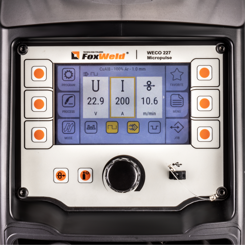 Сварочный полуавтомат FOXWELD WECO MIG 227 DP DIGITAL разработан для обеспечения сварщиков легким и мобильным сварочным аппаратом, который благодаря уменьшенному объёму можно легко перемещать в любом месте, в том числе при проведении сварки в труднодоступных местах. Перемещение аппарата облегчается благодаря эргономичной верхней ручке. 2-роликовый механизм подачи с оптическим датчиком обеспечивает эффективную и точную подачу проволоки. Наличие мощного микропроцессора позволяет полностью управлять всеми функциями сварки, делая систему пригодной для различных видов сварочного процесса. С помощью USB-разъёма можно обновить программное обеспечение аппарата, записать на USB-накопитель сохранённые режимы сварки и перенести их с одного аппарата на другой.Аппараты FoxWeld серии WECO собрали в себе опыт разработки и эксплуатации профессионального сварочного оборудования, начиная с 1998 г. Все аппараты линейки WECO разрабатываются и производятся в Италии на заводе Corso Noblesville. Высокое качество производства и надежность наших аппаратов позволяют обеспечивать расширенную гарантию на всю линейку FoxWeld серии WECO.ФУНКЦИЯ POWER FOCUS: Концентрация дуги POWER FOCUS позволяет сварщику сфокусировать высокую температуру дуги в центральной части сварочной ванны, избегая таким образом перегрева кромок. Это новая технология сварки деталей из углеродистой стали используется, когда требуется глубокий провар в сочетании с высокой производительностью. Сфокусированная дуга позволяет делать меньшее число проходов для заполнения стыковых швов.ФУНКЦИЯ POWER ROOT: Функция вместе с синергетическими программами оптимизирует холодно-капельный перенос металла для получения высокого качества сварки корневого шва углеродистых и нержавеющих сталей, в том числе аустенитных. Технология обеспечивает улучшенную форму шва при сварке тонких деталей и при выполнении вертикальных швов с большим зазором.WECO DIGITAL CONTROL TECHNOLOGY: Мгновенная стабильность и оптимальный баланс дуги от зажигания до завершения сварочного процесса. Цифровое управление инвертором позволяет быстро и точно регулировать характеристики процесса. Сварочные параметры динамически контролируются и изменяются в режиме реального времени.WECO PFC: Цифровой импульсный режим сварки значительно снижает общие затраты на потребляемую электроэнергию благодаря корректору коэффициента мощности (PFC). Экономия электроэнергии по сравнению с традиционным инвертором составляет 30 %, а по сравнению с электромеханическим сварочным аппаратом – 45 %.РЕЖИМ GENERATOR: Специальный режим для работы от генератора позволяет оптимизировать потребляемую мощность от номинальной мощности используемого генератора, защищая сварочный аппарат и используя всю доступную мощность.ПРЕИМУЩЕСТВА:Двойной импульс, обеспечивающий качественную и надёжную сварку алюминия и нержавеющей сталиСинергетический режим управленияВозможность загрузки/сохранения/передачи 99 программ сварки2-роликовый механизм подачи проволоки с цифровым интерфейсом и возможностью бесперебойной работы до 50 мЗащитный экран передней панели управленияСветодиодная подсветка в отсеке подачи проволокиРежимы работы горелки 2T, 4T, SP2T, SP4T, SPOTМаксимальный ток 220 A в режимах MIG/MAG, TIG LIFTРегулируемые функции Arc Force и Hot Start в режиме MMAФУНКЦИОНАЛЬНЫЕ ОСОБЕННОСТИ:QUICK SETTING: Интуитивно понятный и удобный