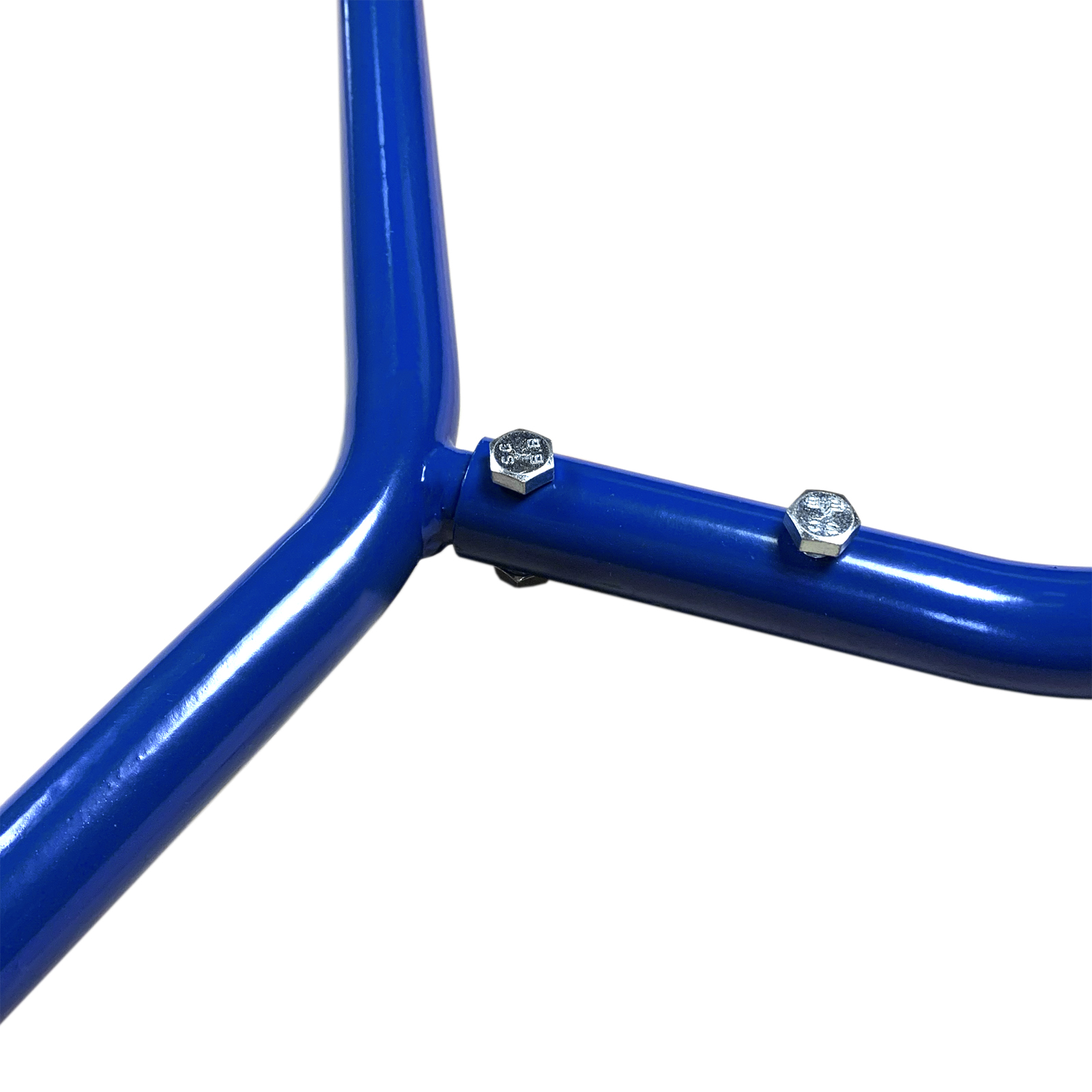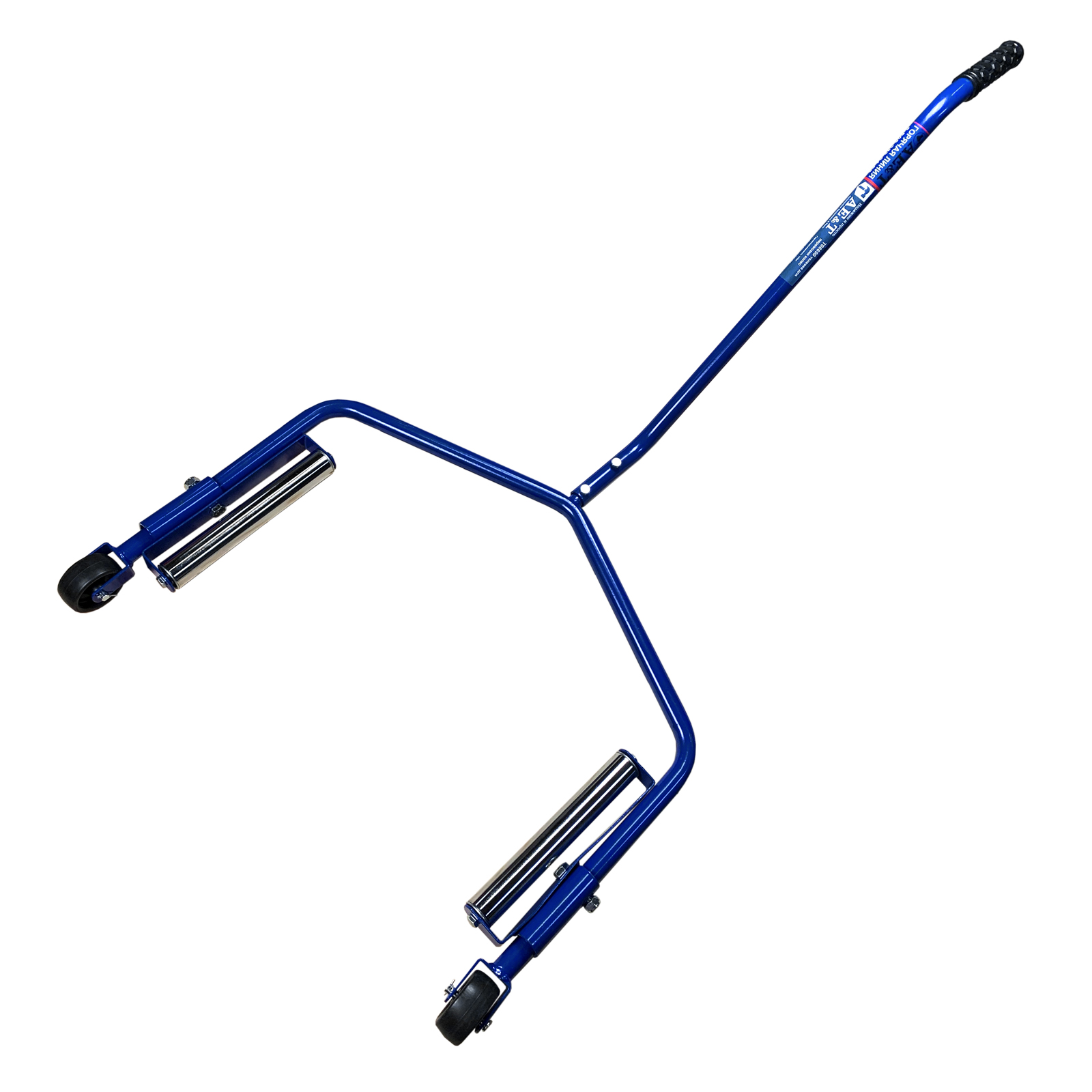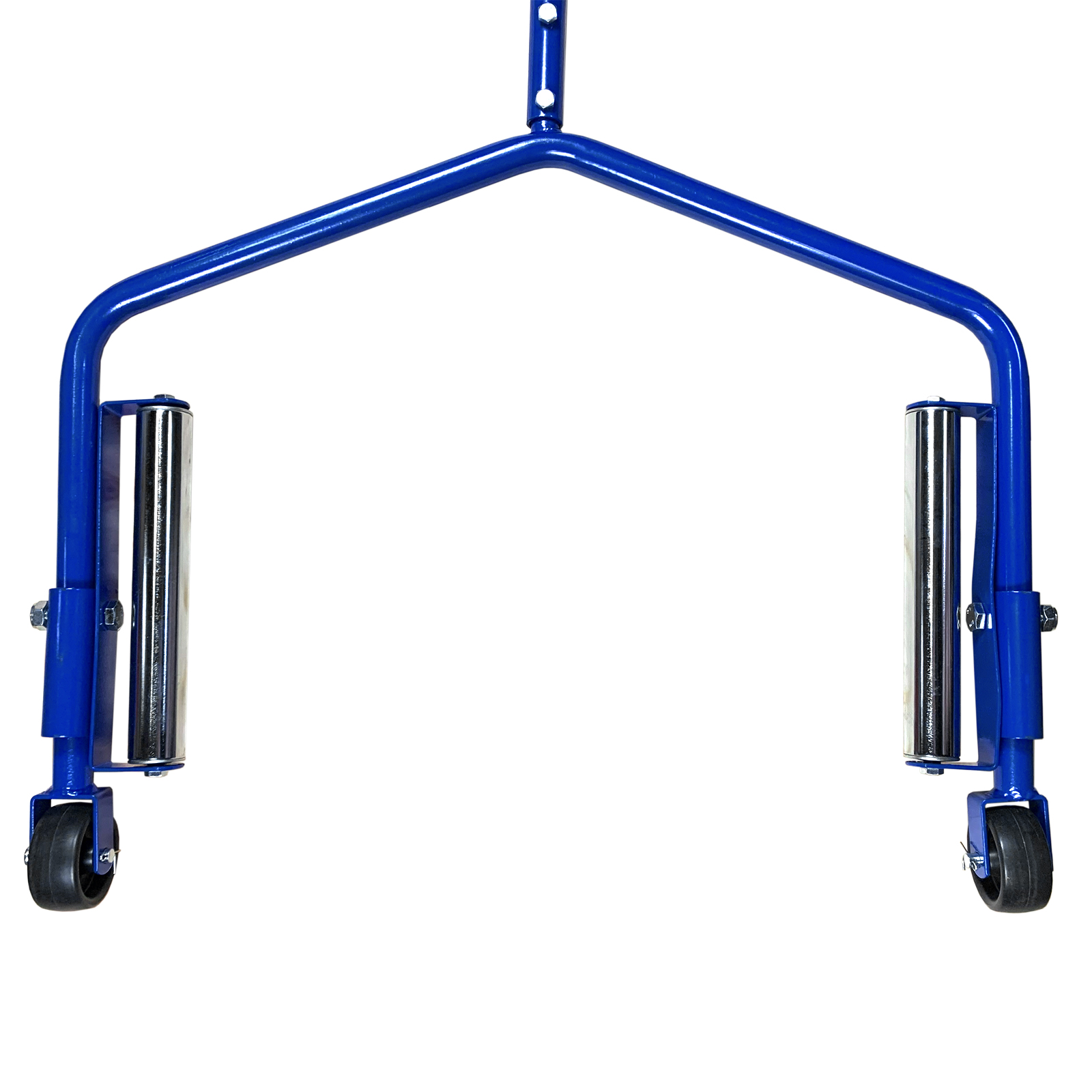 Мощная тележка выдерживает вес до 135 кг и представляет собой металлическую раму на двух колесиках. Опорные части конструкции оснащены роликами, что позволяет вращать и позиционировать колесо.