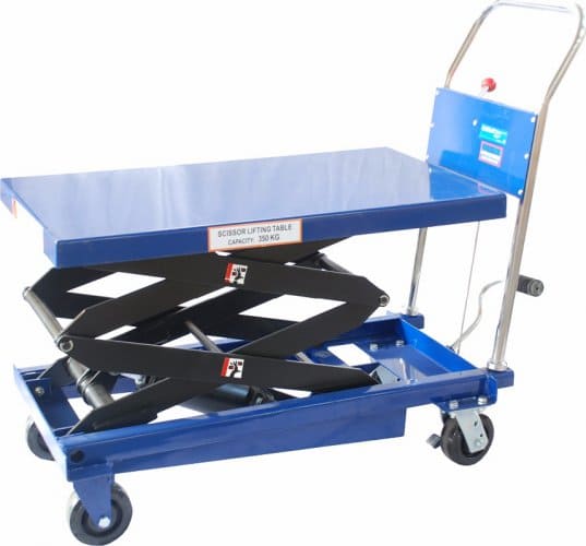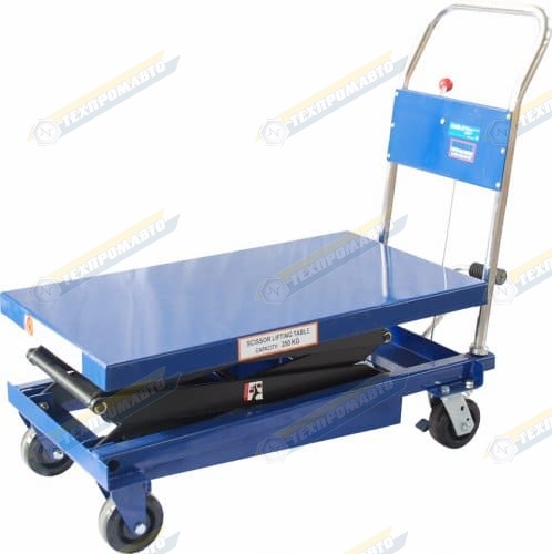 Тележка гидравлическая платформенная на 350 кг можеть быть использована на складах для комплектования груза на поддонах и паллетах, а также в автосервисах при проведении ремонтных работ.