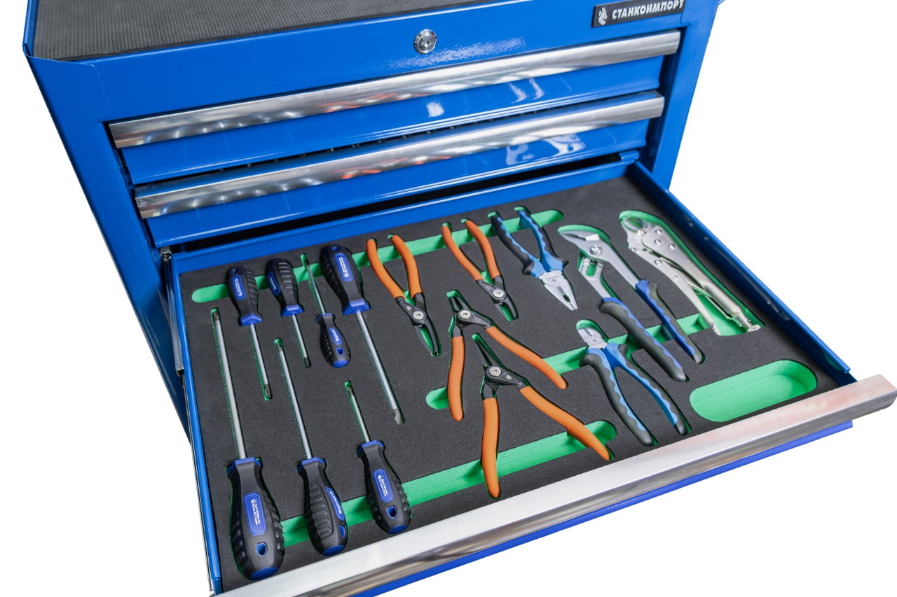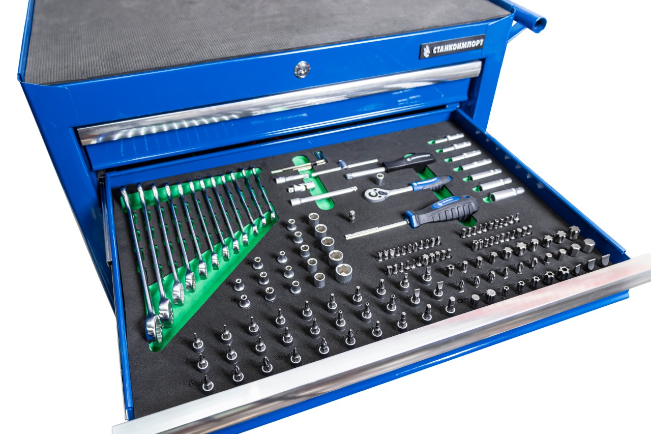 Тележки инструментальные СТАНКОИМПОРТ серии BTD предназначены для использования на предприятиях любого профиля осуществляющих ремонт, обслуживание и изготовление продукции. Наибольшей популярностью тележки инструментальные пользуются в сфере авторемонта и обслуживания автомобилей. Тележки имеют систему антиопрокидования (ODOO), которая предотвращающает одновременное открывание всех ящиков, а следовательно опрокидывание телеги. Что может привести к травмам персонала и материальными потерями. Ящики имеют центральный замок, который позволяет ограничить доступ посторонних лиц к содержимому ящиков. Усиленные шариковые направляющие с автовозвратом позволяют выдерживать нагрузку в 40 кг на ящик и предотвращают открывание при перемещении тележки. В каждый ящик вложена подложка из материала EVA толщиной 2,5 мм, которая предотвращает скольжение ложемента с инструментом в ящике при открытии ящика или перемещении тележки. Ящики имеют аллюминиевую рукоятку для более удобного открывания. Корпус тележки и ее ящиков изготовлен из высококачественной стали толщиной 0,8 мм, а так же имеет ребра жесткости, что существенно увеличивает ресур тележки. Тележки для инструмента оснащены двумя не поворотными колесами диаметром 120 мм, двумя поворотными 120 мм изготовленных из PP (полипропилена) со стопором, которое фиксирует тележку и предотвращает непроизвольное скатывание. Верхняя поверхность тележки имеет маслобензостойкий коврик толщиной 5 мм. Три ящика тележки снабжены профессиональным инструментом в количестве 232 предмета. Данный комплект можно назвать как стартовый так как включает в себя ручной инструмент с посадочным квадратом 1/4, 3/8 и 1/2 дюйма, большое количество и разновидности бит, отвертки, губцевый инструмент и съемники стопорных колец, что вполне достаточно для выполнения довольно широкого спектра проводимых работ. Весь инструмент изготовлен из высокачественой инструментальной стали с соблюдение всех стандартов ГОСТ и DIN. Характеристики ложементов: Размер ложемента: 570х385х30 мм. Материал ложемента: EVA foam. Упаковка: картонная коробка. Количество предметов: 232 шт. Количество ложементов в комплекте: 3 шт Комплектация: Торцевые головки на 1/4 ” - 4, 4.5, 5, 5.5, 6-14 мм Торцевые головки длинные на 1/4” - 4, 5, 7, 8, 9, 10 мм Торцевые головки E-Star на 1/4” - Е4, E5, Е6, Е7, Е8 Ключ трещоточный с быстрым сбросом на 1/4”, 45 зубов Отверточная рукоятка на 1/4”, длинна 150 мм Вороток Т-образный на 1/4”, длинна 110 мм Удлинители на 1/4” - 50, 75 мм Кардан шарнирный на 1/4”, длинна 40 мм Торцевые головки со вставкой на 1/4”: - Шестигранные HEX 3, 4, 5, 6 мм - Шлицевые Slot 4, 5.5, 6.5, 7 мм - Крестовые Philips РН0, РН1, РН2 - Pozidriv PZ0, PZ1, PZ2 - Torx Т8, T9, Т10, Т15, Т20, Т25, Т27, Т30 - Torx BO ТH8, TH9, ТH10, ТH15, ТH20, ТH25, ТH27, ТH30 Адаптер для бит 1/4"х1/4" Отвертка для бит с магнитом 1/4" Биты на 1/4": - Шестигранные HEX BO 2, 2.5, 3, 4, 5, 6 мм - Torx T5, T6 - Torx BO TH7 - Keyway M5, M6, M7, M8, M9 - Muc…