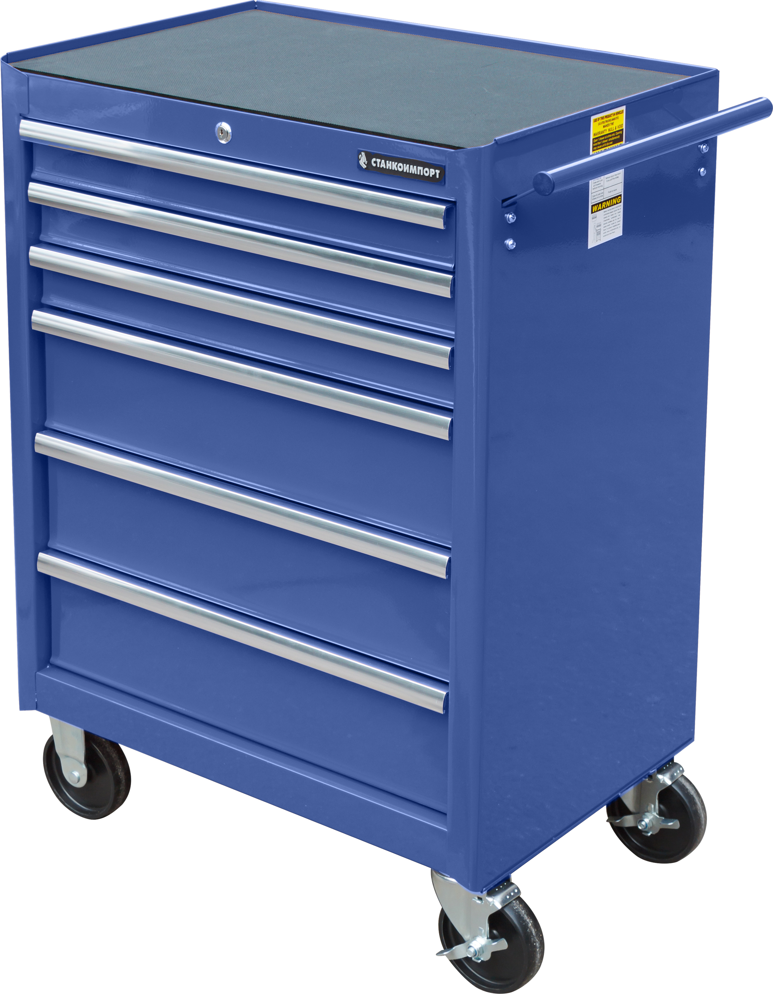 Тележки инструментальные СТАНКОИМПОРТ серии BTD предназначены для использования на предприятиях любого профиля осуществляющих ремонт, обслуживание и изготовление продукции. Наибольшей популярностью тележки инструментальные пользуются в сфере авторемонта и обслуживания автомобилей.  Корпус тележки и ее ящики изготовлены из высококачественной стали толщиной 0,8 мм, а так же имеет ребра жесткости, что существенно увеличивает ресур тележки. Ящики имеют центральный замок, который позволяет ограничить доступ посторонних лиц к содержимому ящиков. Усиленные шариковые направляющие с автовозвратом позволяют выдерживать нагрузку в 30 кг на ящик и предотвращают открывание при перемещении тележки. В каждый ящик вложена подложка из материала EVA толщиной 2,5 мм, которая предотвращает скольжение ложемента с инструментом в ящике при открытии ящика или перемещении тележки. Ящики имеют аллюминиевую рукоятку для более удобного открывания. Тележки покрашены порошковой краской синего цвета RAL 5002. Тележки для инструмента оснащены двумя не поворотными колесами диаметром 120 мм, двумя поворотными 120 мм изготовленных из PP (полипропилена) со стопором, которое фиксирует тележку и предотвращает непроизвольное скатывание. Верхняя поверхность тележки имеет маслобензостойкий коврик толщиной 5 мм. Габаритные размеры ящика: 568x398x75 мм - 3 шт. Габаритные размеры ящика: 568x398x154 мм - 3 шт. Наполнить свою тележку