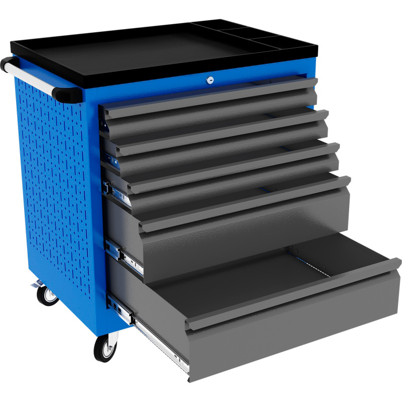 Тележки инструментальные серии PROFFI 795 предназначены для использования на предприятиях любого профиля осуществляющих ремонт, обслуживание и изготовление различной продукции. Тележки изготовлены высотой 795 мм что позволяет размещать их под верстаками и рабочими столами серии PROFFI, что позволяет сэкономить рабочее пространство помещении. На боковые стенки инструментальной тележки нанесена перфорация размером 25х25 мм и диаметром отверстия 8 мм, что позволяет устанавливать на них навесной инструмент или крючки. Наибольшей популярностью тележки инструментальные пользуются в сфере авторемонта и обслуживания автомобилей. Тележки имеют выдвижные ящики на шариковых телескопических направляющих полного выдвижения с фиксацией на ключ в закрытом положении, предотвращающее открывание при передвижении тележки. Ящики имеют центральный замок, который позволяет ограничить доступ посторонних лиц к содержимому ящиков. Тележка инструментальная изготовлена из высококачественного металла ведущих российских производителей, покрашена порошковой краской производства Германии, имеет фурнитуру произведенную в Италии и Турции. Тележки для инструмента оснащены двумя не поворотными колесами диаметром 100 мм, одним поворотным и одним поворотным со стопором, которое фиксирует тележку и предотвращает непроизвольное скатывание. Тележки инструментальные серии PROFFI 795 комплектуются тремя видами ящиков: Малый ящик (в х ш х г), мм - 75 х 570 х 430 Средний ящик (в х ш х г), мм - 150 х 570 х 430 Большой ящик (в х ш х г), мм - 225 х 570 х 430 Грузоподъемность ящиков до 30 кг.