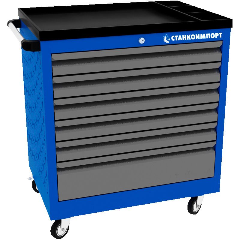 Тележки инструментальные серии PROFFI 795 предназначены для использования на предприятиях любого профиля осуществляющих ремонт, обслуживание и изготовление различной продукции. Тележки изготовлены высотой 795 мм что позволяет размещать их под верстаками и рабочими столами серии PROFFI, что позволяет сэкономить рабочее пространство помещении. На боковые стенки инструментальной тележки нанесена перфорация размером 25х25 мм и диаметром отверстия 8 мм, что позволяет устанавливать на них навесной инструмент или крючки. Наибольшей популярностью тележки инструментальные пользуются в сфере авторемонта и обслуживания автомобилей. Тележки имеют выдвижные ящики на шариковых телескопических направляющих полного выдвижения с фиксацией на ключ в закрытом положении, предотвращающее открывание при передвижении тележки. Ящики имеют центральный замок, который позволяет ограничить доступ посторонних лиц к содержимому ящиков. Тележка инструментальная изготовлена из высококачественного металла ведущих российских производителей, покрашена порошковой краской производства Германии, имеет фурнитуру произведенную в Италии и Турции. Тележки для инструмента оснащены двумя не поворотными колесами диаметром 100 мм, одним поворотным и одним поворотным со стопором, которое фиксирует тележку и предотвращает непроизвольное скатывание. Тележки инструментальные серии PROFFI 795.6 комплектуются двумя видами ящиков: Малый ящик (в х ш х г), мм - 75 х 570 х 430 - 5 шт. Средний ящик (в х ш х г), мм - 150 х 570 х 430 - 1 шт. Наполнить свою тележку Грузоподъемность ящиков до 30 кг.