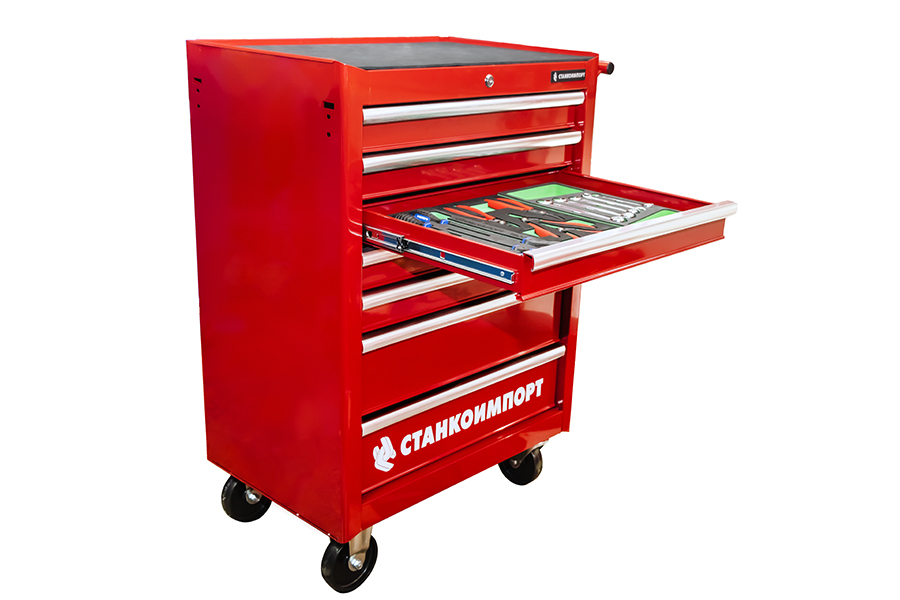 Тележки инструментальные СТАНКОИМПОРТ серии BTD предназначены для использования на предприятиях любого профиля осуществляющих ремонт, обслуживание и изготовление продукции. Наибольшей популярностью тележки инструментальные пользуются в сфере авторемонта и обслуживания автомобилей. Корпус тележки и ее ящики изготовлены из высококачественной стали толщиной 0,8 мм, а так же имеет ребра жесткости, что существенно увеличивает ресур тележки. Ящики имеют центральный замок, который позволяет ограничить доступ посторонних лиц к содержимому ящиков. Усиленные шариковые направляющие с автовозвратом позволяют выдерживать нагрузку в 30 кг на ящик и предотвращают открывание при перемещении тележки. В каждый ящик вложена подложка из материала EVA толщиной 2,5 мм, которая предотвращает скольжение ложемента с инструментом в ящике при открытии ящика или перемещении тележки. Ящики имеют аллюминиевую рукоятку для более удобного открывания. Тележки покрашены порошковой краской красного цвета RAL 3002. Тележки для инструмента оснащены двумя не поворотными колесами диаметром 120 мм, двумя поворотными 120 мм изготовленных из PP (полипропилена) со стопором, которое фиксирует тележку и предотвращает непроизвольное скатывание. Верхняя поверхность тележки имеет маслобензостойкий коврик толщиной 5 мм. Тележки инструментальные СТАНКОИМПОРТ серии BTD комплектуются двумя видами ящиков: Габаритные размеры ящика: 568x398x75 мм - 5 шт. Габаритные размеры ящика: 568x398x154 мм - 2 шт Наполнить свою тележку