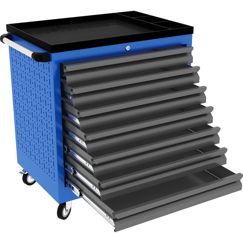 Тележки инструментальные серии PROFFI 795 предназначены для использования на предприятиях любого профиля осуществляющих ремонт, обслуживание и изготовление различной продукции. Тележки изготовлены высотой 795 мм что позволяет размещать их под верстаками и рабочими столами серии PROFFI, что позволяет сэкономить рабочее пространство помещении. На боковые стенки инструментальной тележки нанесена перфорация размером 25х25 мм и диаметром отверстия 8 мм, что позволяет устанавливать на них навесной инструмент или крючки. Наибольшей популярностью тележки инструментальные пользуются в сфере авторемонта и обслуживания автомобилей. Тележки имеют выдвижные ящики на шариковых телескопических направляющих полного выдвижения с фиксацией на ключ в закрытом положении, предотвращающее открывание при передвижении тележки. Ящики имеют центральный замок, который позволяет ограничить доступ посторонних лиц к содержимому ящиков. Тележка инструментальная изготовлена из высококачественного металла ведущих российских производителей, покрашена порошковой краской производства Германии, имеет фурнитуру произведенную в Италии и Турции. Тележки для инструмента оснащены двумя не поворотными колесами диаметром 100 мм, одним поворотным и одним поворотным со стопором, которое фиксирует тележку и предотвращает непроизвольное скатывание. Тележки инструментальные серии PROFFI 795.7 комплектуются ящиком с габаритными размерами (Высота х Ширина х Глубина), мм - 75 х 570 х 430 - 7 шт. Грузоподъемность ящиков до 30 кг.
