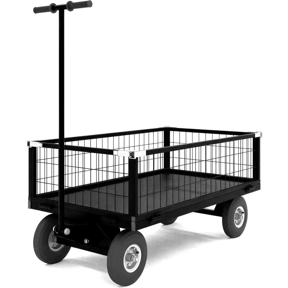Тележка платформенная с поворотной осью, усиленная 600x900x300 Gigant ТППО-002 оснащена бортиками из металлических труб, которые предотвращают скатывание груза с платформы. Изделие способно выдерживать нагрузку до 450 кг. Прочная конструкция обладает четырьмя пневматическими колесами диаметром 250 мм. Тележка имеет поворотную ось для удобства разворачивания конструкции. Полимерное порошковое покрытие устойчиво к влиянию коррозии, что дает возможность использовать тележку на открытом воздухе даже при неблагоприятных погодных условиях. Специальные резиновые накладки на рукоятке обеспечивают надежный захват без эффекта проскальзывания рук. Благодаря системе навесом установка и съем бортов осуществляется максимально легко.