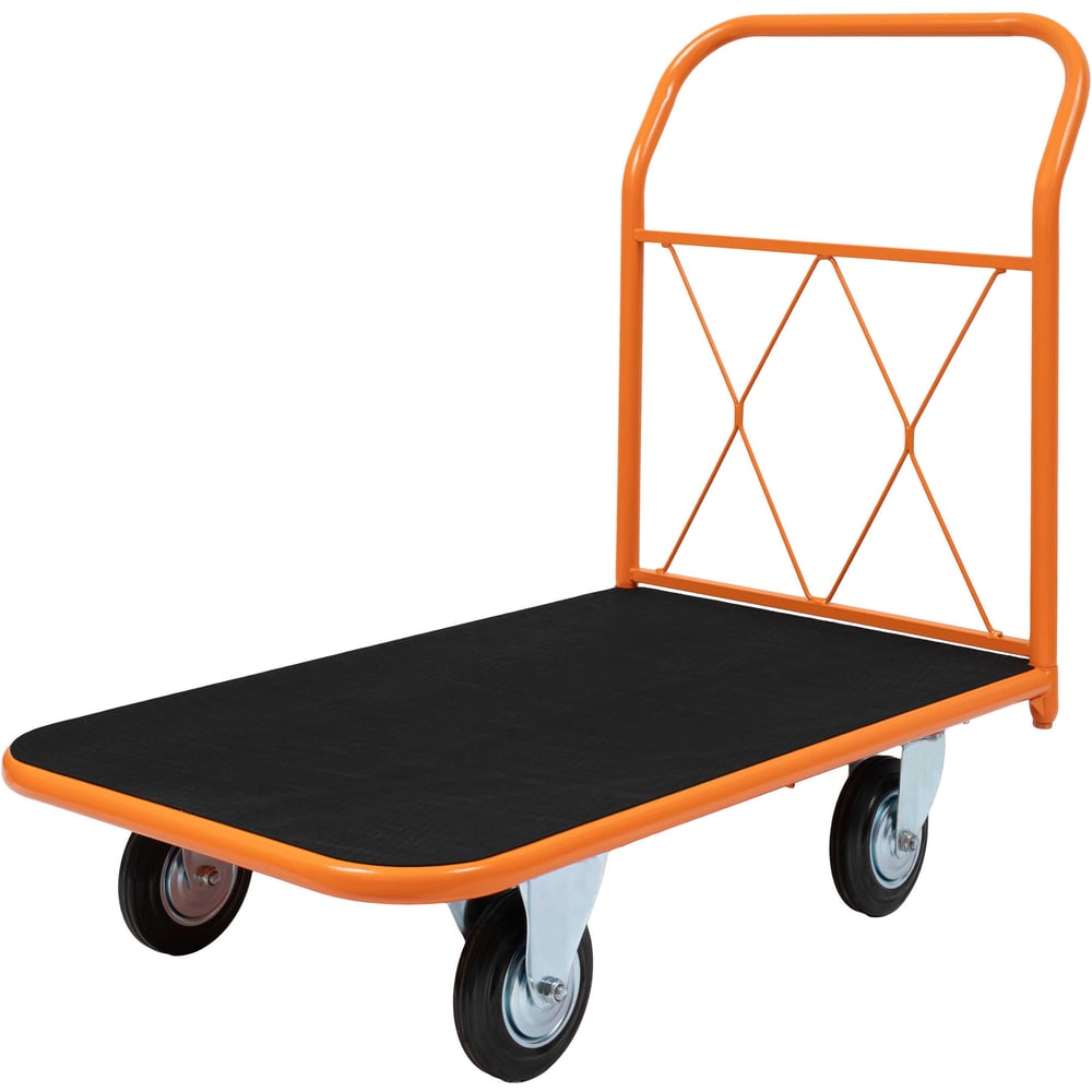Тележка платформенная с резиновым покрытием 600х1000 D160мм Gigant ТПР-002 является прочным и простым в использовании приспособлением, которое служит для перевозки различных товаров. На платформе предусмотрено резиновое противоскользящее покрытие, которое исключает скатывание груза с тележки, а специальные резиновые накладки на рукоятке обеспечат надежный захват без эффекта проскальзывания рук. Полимерное порошковое покрытие устойчиво к влиянию коррозии, что дает возможность использовать тележку на открытом воздухе даже при неблагоприятных погодных условиях. Изделие способно выдерживать нагрузку до 450 кг. Прочная конструкция обладает четырьмя литыми колесами диаметром 160 мм.