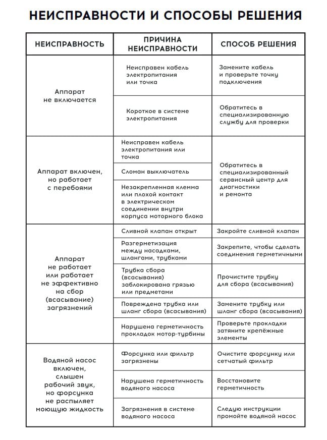 7. После запуска водяного насоса, если насос работает в течении 1 минуты, но не качает воду/моющее средство, он должен быть остановлен. Повторный запуск возможен только после того как будет обнаружена и устранена причина неработоспособности.