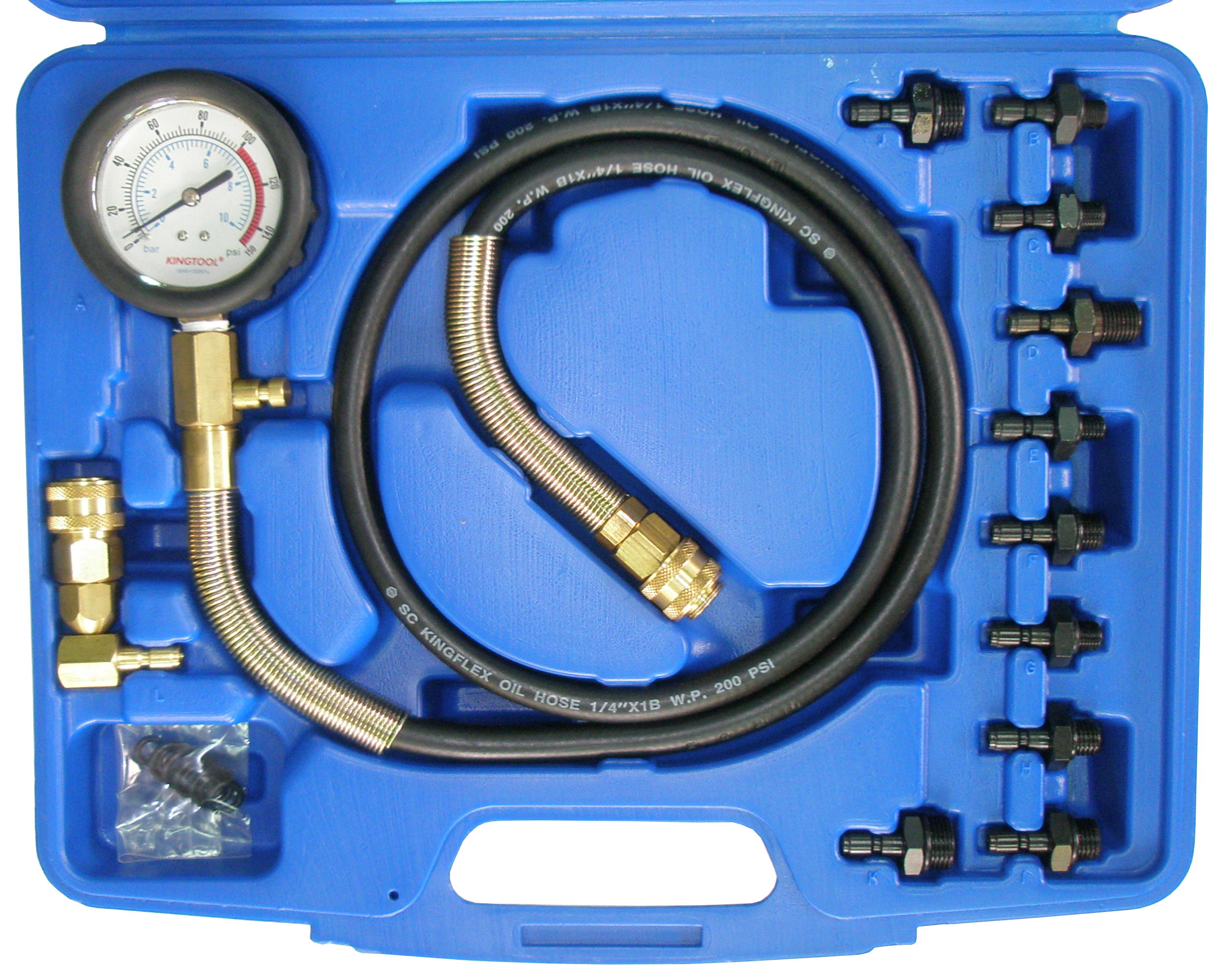 KA-6722KN Набор для тестирования давления масла Характеристика: позволяет тестировать работы масляного насоса легок в использовании безошибочно тестирует давление масляного насоса быстрозажимные адаптеры с отсечным клапаном длинный гибкий шланг длина шланга: 1300 мм манометр: диаметр 83 мм, шкала – 0-10 бар резьба адаптеров: 1/8х28PT, 1/8х27NPT, 1/4х18NPT, 3/8x20UNF, 1/2x20UNF, M10x1.0, M12x1.5, M14x1.5, M16x1.5, M18x1.5 90 град. патрубок Для автомобилей AUDI BMW CITROEN DIAHATSU FIAT FORD HONDA HYUNDAI ISUZU JAGUAR LADA LANCIA МAZDAMERCEDES_BENZ MITSUBISHI NISSAN OPEL PEUGEOT RENAULT ROVER SAAB SKODA SUBARU SUZUKI TOYOTA VAUXHALL ZASTAVA
