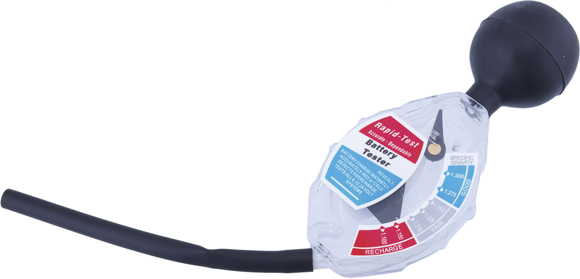 KA-3338 тестер электролита батарей Позволяет предупредить полный разряд аккумуляторной батареи и продлить срок её службы. Подходит для 6, 12 и 24-вольтовых систем. Открутите пробку аккумулятора. Сожмите «грушу» тестера, выпустив из него воздух. Погрузите конец резинового шланга в электролит. Закачайте электролит в резервуар тестера, вернув «грушу» в исходное состояние до контрольной отметки. Оцените качество электролита (состояние АКБ) по положению стрелки тестера. Будьте осторожны при работе с аккумуляторными батареями! Не допускайте попадания электролита на поверхность кожи, в глаза и слизистые оболочки. Использование прибора допускается только квалифицированным персоналом с соблюдением техники безопасности!