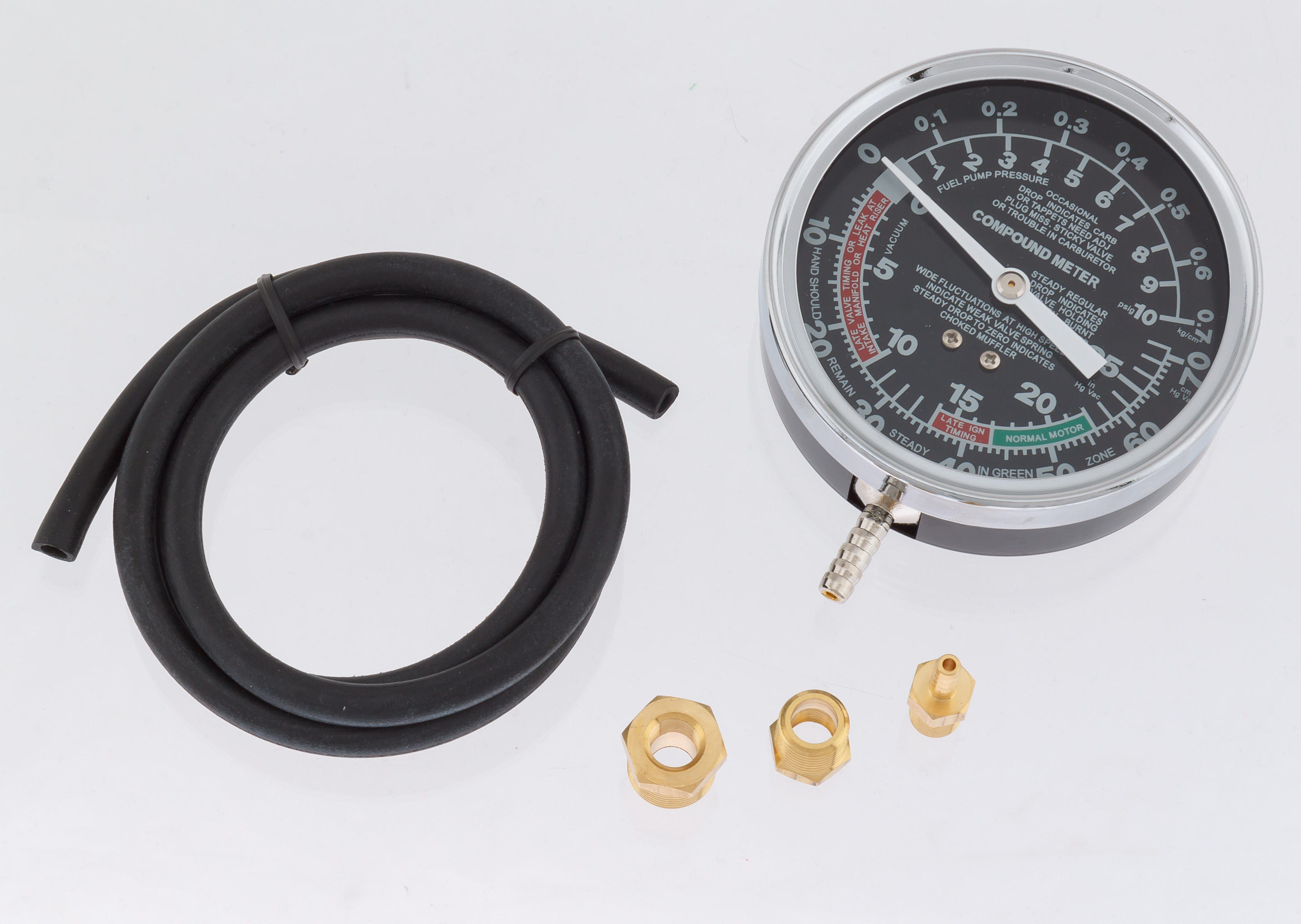 Предназначен для диагностики утечки в вакуумной и топливной системе, тестирования вакуумного и топливного насоса, определять неполадки клапанного механизма. Состав: - манометр диаметр 3-1/2"с легкочитаемой и цветной шкалой - резиновый шланг, 1м - 2 адаптера 18 мм и 1 адаптер - 14 мм. - картонная коробка