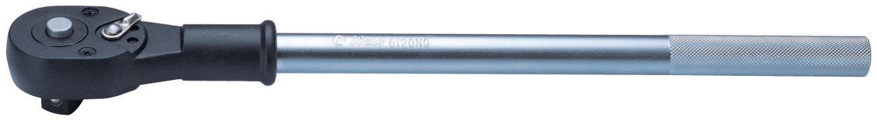 6120NQ трещетка на 3/4" с быстрым сбросом Серия 120NQ имеет трещоточный 24-зубцовый механизм с флажковым переключателем и металлической ручкой c мелкозернистой насечкой, что позволяет не проскальзывать рукоятке во время работы, также имеется кнопка быстрого сброса для быстрой замены инструмента: торцевой головки, удлинителя, карданного шарнира или адаптера-переходника. Механизм имеет устойчивость к загрязнениям и отличается простотой обслуживания. Привод с шагом 150 позволяет работать в ограниченном рабочем пространстве, и прикладывать высокие усилия. Трещотки не рекомендуется использовать в начальной стадии отворачивания резьбовых соединений, если они могли быть подвержены коррозии или был использован фиксатор резьбовых соединений. Желательно сначала «стронуть» соединение мощным приводом: Г-образным или Т-образным воротком. При изготовлении деталей трещоток не используется вторичное сырье.