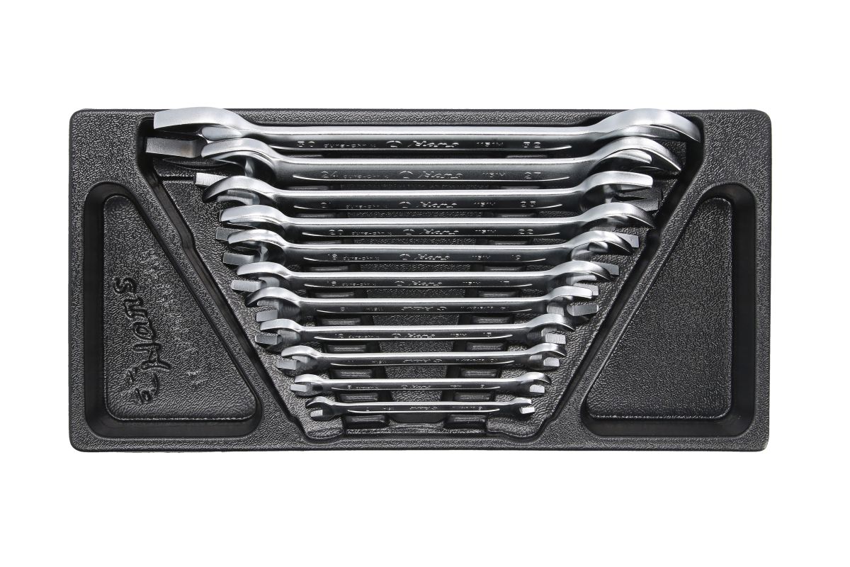 Ложемент ключи рожковые, 11 предметов Hans TT-35 Рожковые ключи широко применяются при проведении слесарно-монтажных работ. Это объясняется уникальным свойством открытого зева, а именно, возможностью работы в том случае, когда доступ к крепежу возможен только с одной стороны. Рожковый профиль позволяет работать с любыми разновидностями шестигранного крепежа, к которым открыт доступ с боку. Отличительной особенность рожковых ключей HANS является применение особой инструментальной стали Dura CrV. Особенностью данной стали является ее Мартенситная структура придающая готовому изделию повышенную прочность и стойкость к коррозии в сравнении со стандартной инструментальной сталью CrV, достигается это за счет применения высокотехнологичного процесса термической обработки. Весь инструмент компании HANS соответствует требованиям стандартов качества ГОСТ и DIN, а по некоторым параметрам их превосходит. Комплектация: Рожковые ключи: 6 x 7 , 8 x 9 , 10 x 11 , 12 x 13 , 14 x 15 , 16 x 17 , 18 x 19 , 20 x 22 , 21 x 23 , 24 x 27 , 30 x 32 мм.