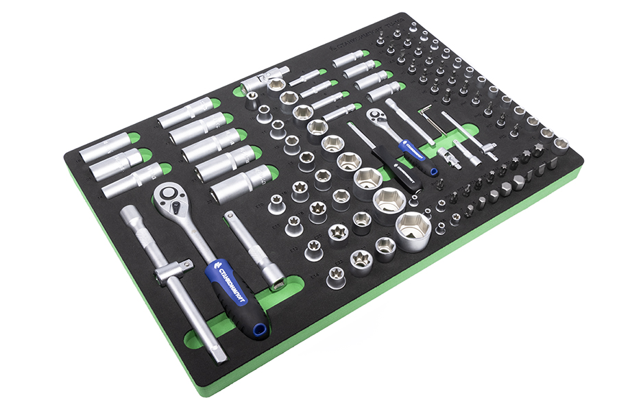 Назначение: В ложементе собраны инструменты общего назначения, необходимые для работы в гараже, мастерских и автосервисах. Описание: Инструменты производятся из хромванадиевой стали. Ручки трещотки, шарнирно-губцевого инструмента, отверток изготовлены из маслобензостойкого материала. Рациональное размещение инструментов в ложементе обеспечивает удобство хранения и транспортировки. Сами инструменты расположены в индивидуальных подписанных ячейках. Инструмент профессионального уровня, соответствует стандартам ГОСТ и DIN. Имеет высокий ресурс, позволяя не беспокоиться о покупке нового инструмента, взамен вышедшего из строя. Особенности: Головки имеют однородное высококачественное покрытие Soft Matt, обеспечивающие надежную защиту от царапин и коррозии. Снабжены специальными фрикционными насечками, предотвращающими выскальзывание из рук. Анатомическая двухкомпонентная рукоятка трещотки изготовлена из маслобензостойкого материала, что делает работу с инструментом комфортной. Соответствует немецким стандартам DIN и сохраняет работоспособность при превышении нагрузки на 70%. Комплектация: НаименованиеОписание торцевые головки 1/4"4, 4.5, 5, 5.5, 6-14 мм торцевые головки длинные 1/4"6-13 мм торцевые головки E-star 1/4"E4, Е5, Е6, Е7, Е8 ключ трещоточный с быстрым сбросом 1/4" 72 зуба отверточная рукоятка 1/4"150 мм вороток Т-образный 1/4"110 мм удлинители 1/4"50, 100 мм кардан шарнирный 1/4"40 мм торцевые головки со вставкой 1/4": - шестигранные НЕХ3, 4, 5, 6 мм - шлицевые SlotSL4, SL5.5, SL6.5 - крестовые PozidrivPZ1, PZ2 - крестовые PhilipsPH1, PH2 - TorxT8, T10, T15, T20, T25, T27, T30 угловой шестигранный ключ1.5, 2, 2.5 мм НаименованиеОписание торцевые головки 1/2"10-22, 24, 27, 30, 32 мм торцевые головки длинные 1/2"14, 15, 17, 19, 21, 22 мм торцевые головки E-Star 1/2"E10, E11, E12, E14, E16, E18, E20, E22 ключ трещоточный с быстрым сбросом 1/2" 72 зуба удлинитель-вороток Т-образный 1/2"250 мм удлинитель 1/2"125 мм головки свечные 1/2"16, 21 мм кардан шарнирный 1/2"75 мм битодержатель 1/2"х 5/16"40 мм биты 5/16": - шестигранные HEX7, 8, 10, 12, 14 мм - шлицевые...