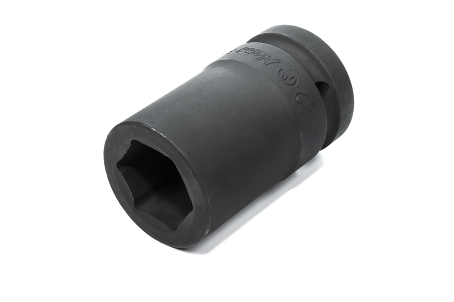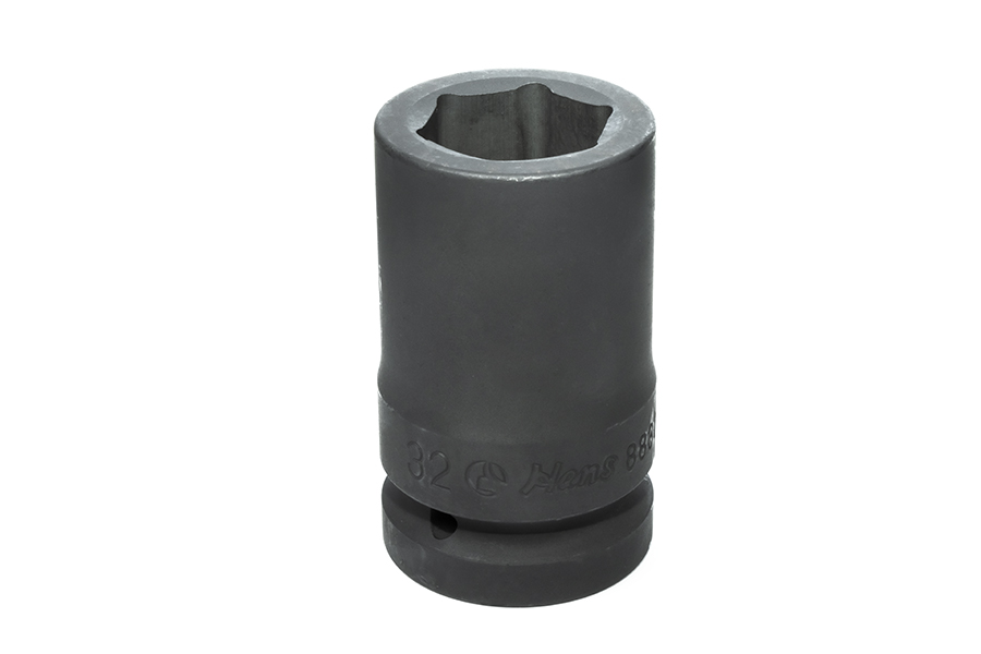 Ударная торцевая головка длинная Hans 32 мм. К ударным головкам предъявляются требования, которые резко отличаются от требований к обычным торцевым головкам. Ведь пневматический инструмент создает нагрузки совсем другого рода, а именно эти нагрузки носят ударный характер. Как следствие главным требованием к ударным головкам является, высокая ударостойкость. Именно этим обусловлено использование специального хром-молибденового сплава при их производстве. Также в качестве антикоррозионной обработки используется термохимическое покрытие — воронение или фосфатирование. Делается это по причине того что, хромникелевое покрытие при ударах может отслаивается. Ударные головки компании Hans изготовлены из высококачественных материалов и соответствуют всем требованиям стандартов ГОСТ и DIN