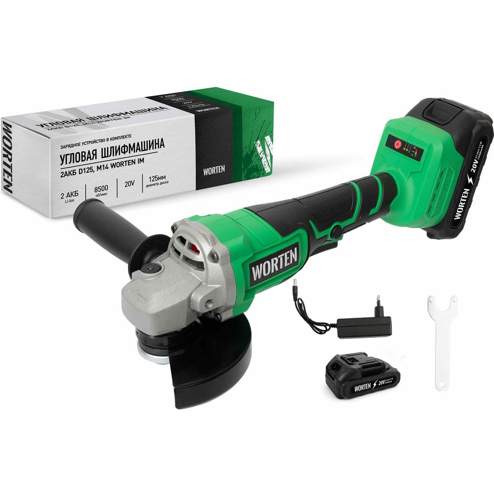 Угловая шлифмашина аккумуляторная WORTEN D125, 20В, 2х1.5 Ач, М14 КА-90000329
