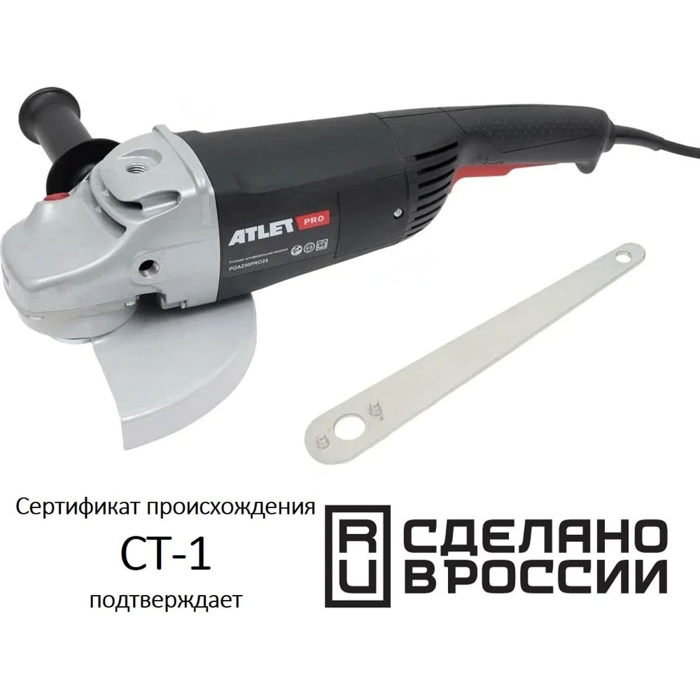 Угловая шлифовальная машина ATLET PRO 2400 Вт. PGA230PRO24 представляет собой профессиональный инструмент, предназначенный для интенсивного использования. Она оснащена мощным щеточным двигателем на 2400 Вт, что обеспечивает высокую производительность и надежность в работе. Диаметр диска составляет 230 мм, что позволяет выполнять резку и шлифовку различных материалов, включая бетон и камень. Устройство поддерживает скорость вращения до 6500 об/мин, что способствует эффективной обработке поверхностей. Для удобства использования предусмотрена сдвижная клавиша включения и кнопка фиксации пуска, а также возможность регулировки положения кожуха без инструмента. Длина кабеля составляет 4 метра, что обеспечивает свободу перемещения во время работы. Инструмент поставляется в компактной коробке, что облегчает его транспортировку и хранение. Аналог Bosch GWS 24-230 с сертификатом производства в России СТ-1