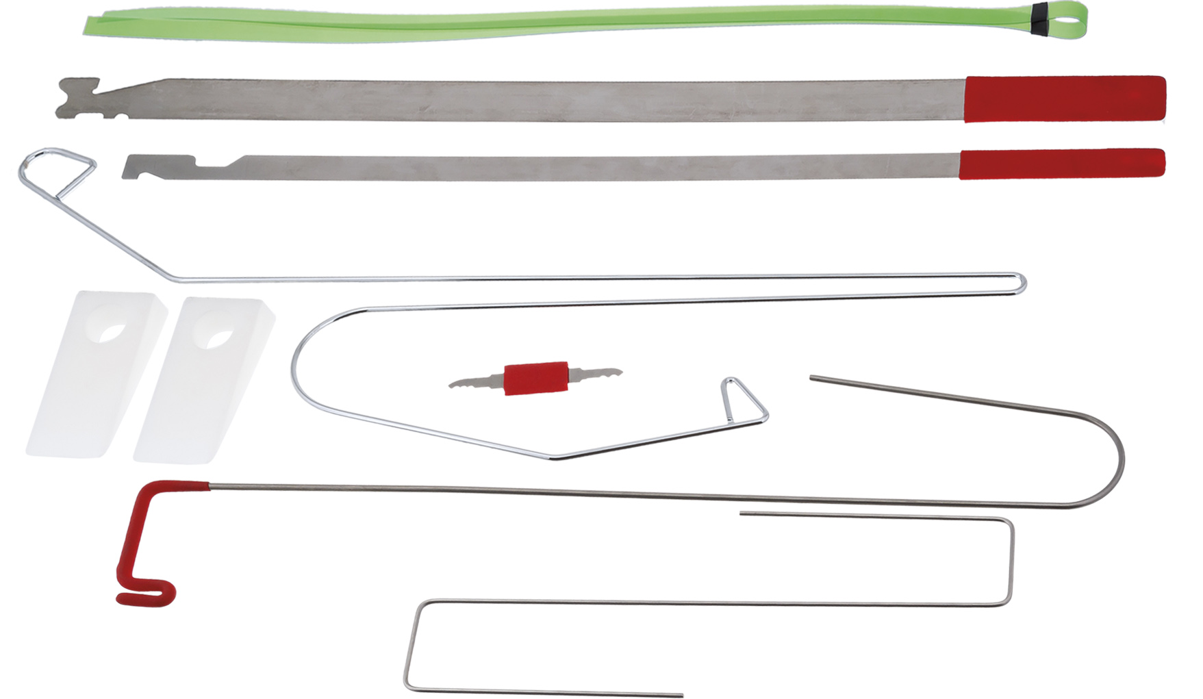 KA-9001-1 Универсальный набор открывания дверей. Предназначен для открывания дверей автомобиля при случайном срабатывании центрального замка или потери ключей. Особенности: Набор включает все необходимые инструменты для открывания дверей автомобилей разных марок и моделей. Позволяет разблокировать замки дверей автомобиля механическим способом, не нанося повреждений декоративным элементам (резиновым уплотнителям, молдингам и т.д.). Специальная отмычка для вскрытия крышки бензобака. Удобный чехол для хранения инструмента. Комплектация: Приспособления для открывания дверей - 9 шт. Инструкция - 1 шт. Чехол для хранения - 1 шт.