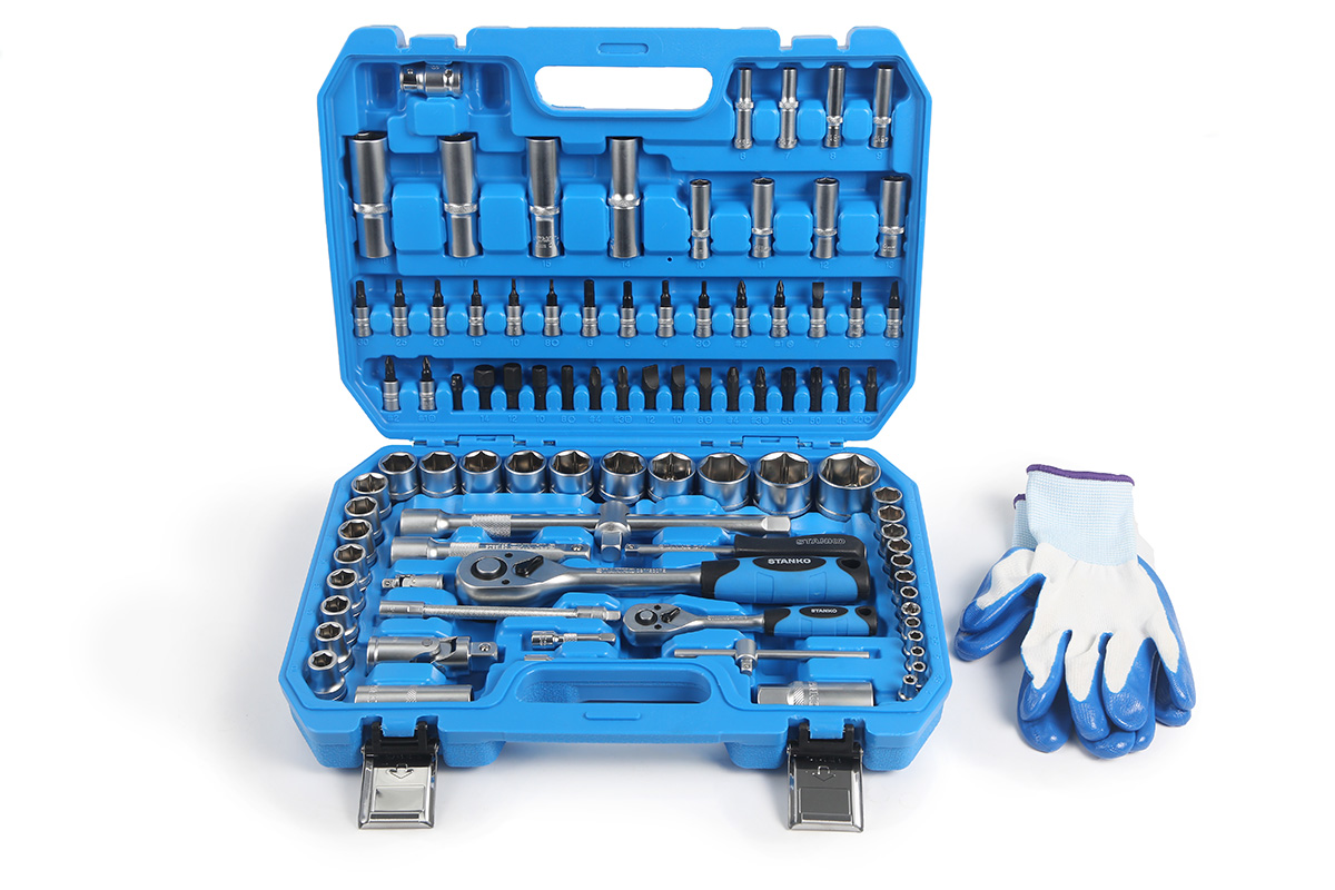 Назначение: Универсальный набор инструментов 94 предмета от бренда STANKO в первую очередь предназначен для монтажных, демонтажных и ремонтных работ. Может применяться как в автосервисах, мастерских и СТО, так и в гараже или дома для бытового использования. Описание: Инструменты из данного набора отличаются износостойкостью: биты изготовлены из высококачественной инструментальной стали S2, а остальные предметы из прочной хромованадиевой стали. Рациональное размещение инструментов в кейсе обеспечивает удобство транспортировки и облегчает поиск необходимого инструмента. Сами инструменты расположены в индивидуальных подписанных ячейках, снабженных фиксаторами. Отвертки, торцевые головки и биты основных типоразмеров выручат в разных ситуациях. Трещоточные ключи имеют механизм 72 зуба с шагом 5° и помогут раскрутить гайки в труднодоступных местах. Карданы и удлинители нужны для еще более эффективного решения задач. Особенности: Анатомическая, двухкомпонентная рукоятка трещотки изготовлена из маслобензостойкого материала, что обеспечивает комфорт в работе. Внутри механизма трещотки установлена специальная плоская пружина, которая исключает люфты. Трещотка имеет металлический флажковый переключатель. Свечные головки снабжены магнитным фиксатором, посаженным через латунное кольцо. Головки снабжены специальными фрикционными насечками, предотвращающими выскальзывание из рук. Весь инструмент имеет хром-никелевое покрытие. В подарок к каждому набору кладем рабочие перчатки универсального размера. Комплектация: НаименованиеОписание торцевые головки 1/4"4, 4.5, 5, 5.5, 6-14 мм торцевые головки длинные 1/4"6-13 мм ключ трещоточный с быстрым сбросом 1/4" 72 зуба отверточная рукоятка 1/4"150 мм вороток Т-образный 1/4"110 мм удлинители 1/4"50, 100 мм гибкий удлинитель 1/4"150 мм кардан шарнирный 1/4"40 мм торцевые головки со вставкой 1/4": - шестигранные НЕХ3, 4, 5, 6 мм - шлицевые SlotSL4, SL5.5, SL6.5 - крестовые PozidrivPZ1, PZ2 - крестовые PhilipsPH1, PH2 - TorxT10, T15, T20, T25, T27, T30 угловой шестигранный ключ1.5, 2, 2.5 мм НаименованиеОписание торцевые головки 1/2"10-24, 27, 30, 32 мм торцевые головки длинные 1/2"14, 15, 17, 19 мм ключ трещоточный с быстрым сбросом 1/2" 72 зуба удлинитель-вороток Т-образный 1/2"250 мм удлинитель 1/2"125 мм головки свечные 1/2"16,...