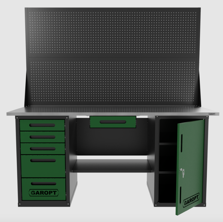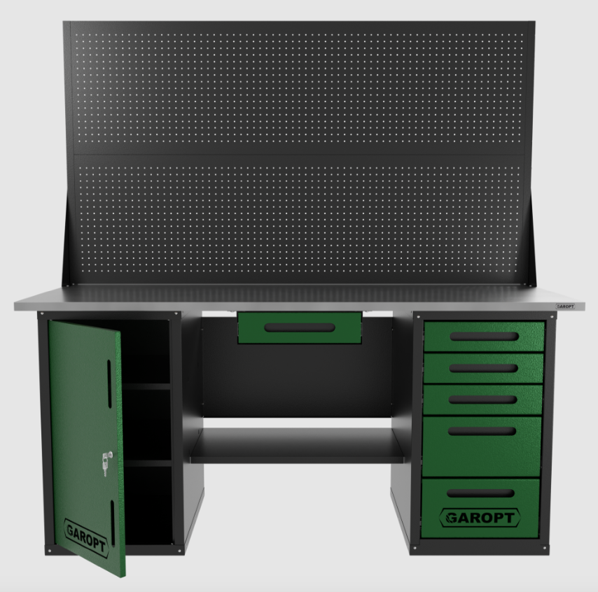 Верстак двухтумбовый дверь/5 ящиков с двумя экранами и ящиком, зеленый 1800*700 Garopt, GT1800DY1Y5PP2.green