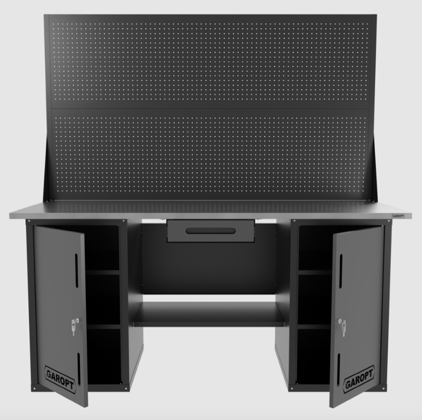 Верстак двухтумбовый с двумя экранами и ящиком, серый 1800*700 Garopt, GT1800DDY1PP2.grey
