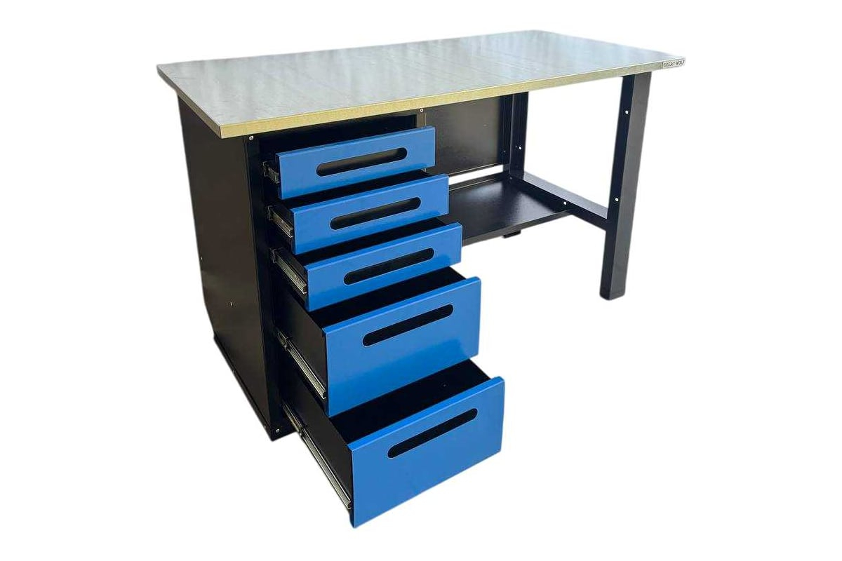 - Удобная организация хранения — тумба с 5 ящиками (2 высоких и 3 низких) и дополнительная полка для инструмента и материалов.