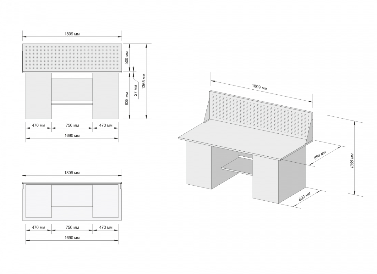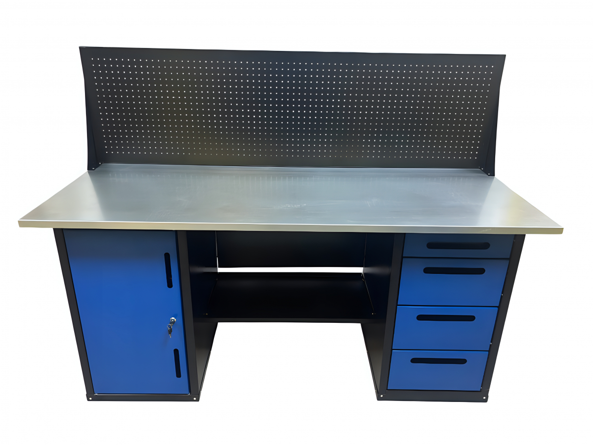 Усиленная столешница (1800х700х27мм) из МДФ и оцинкованного металла позволяет закрепить тиски и производить любые силовые работы по ремонту.